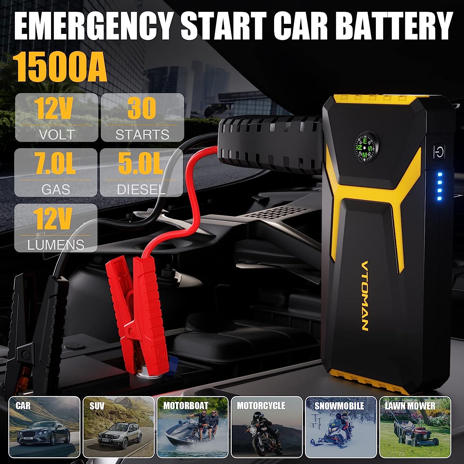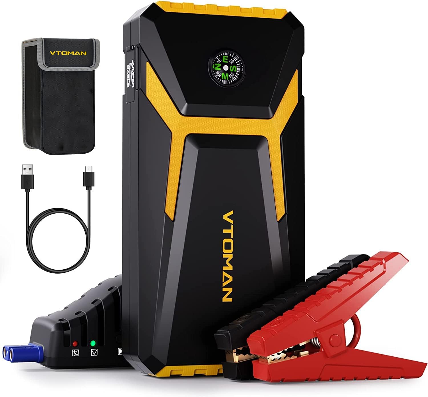 VTOMAN V6 Jump Starter, 1500A Peak Portable Jump Starter Box (Up to 7L Gas/5L Diesel Engines) for 12V Car Automobiles Lithium Auto Battery Booster Pack with Power Bank Charger, Jumper Cables(Yellow)