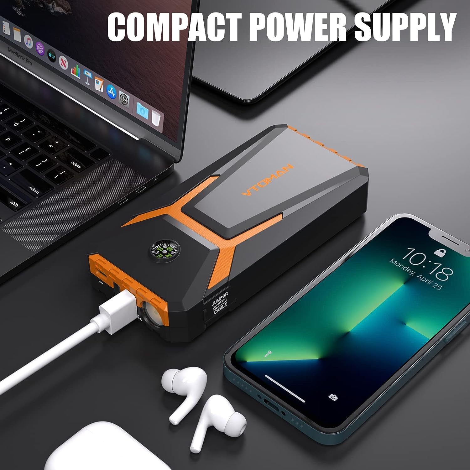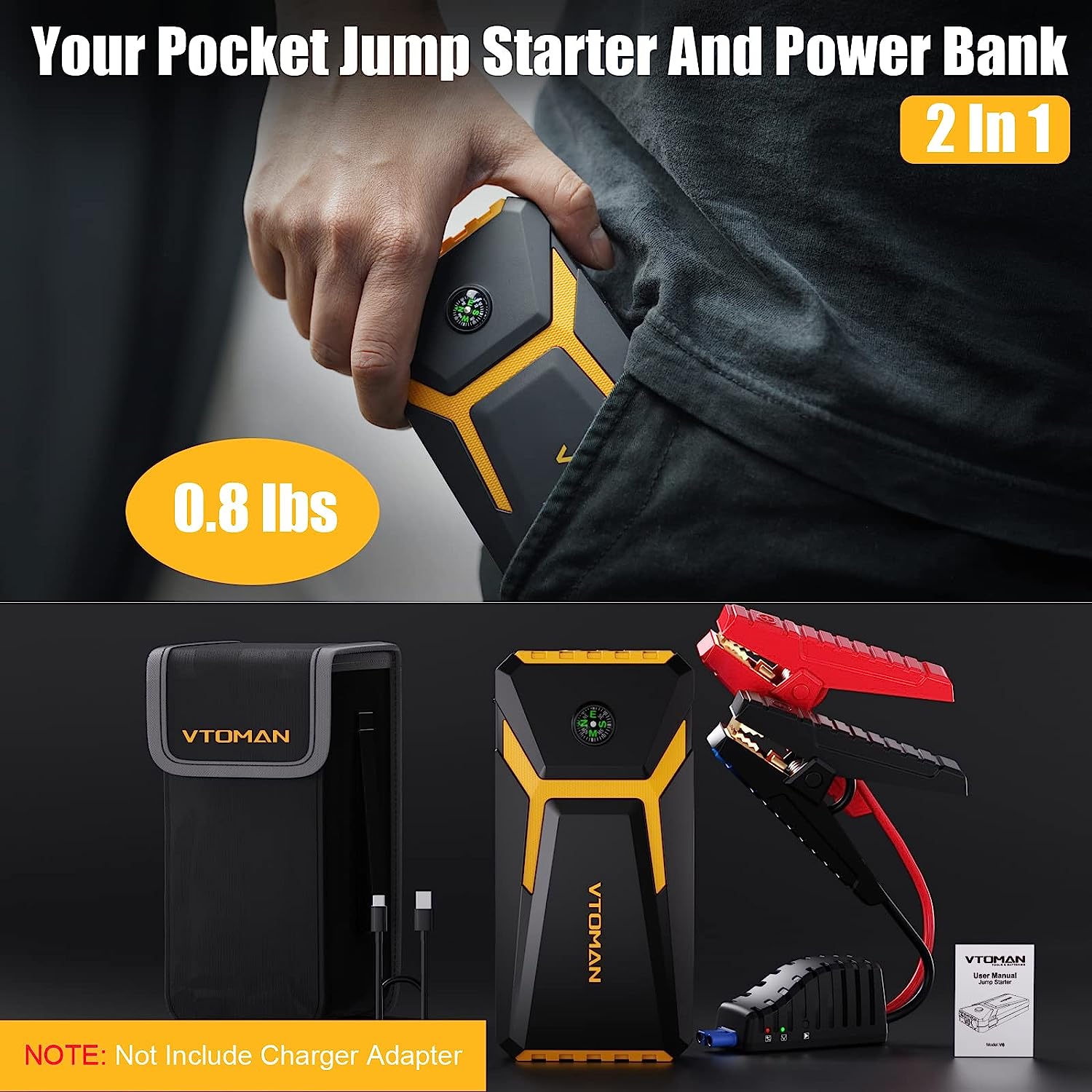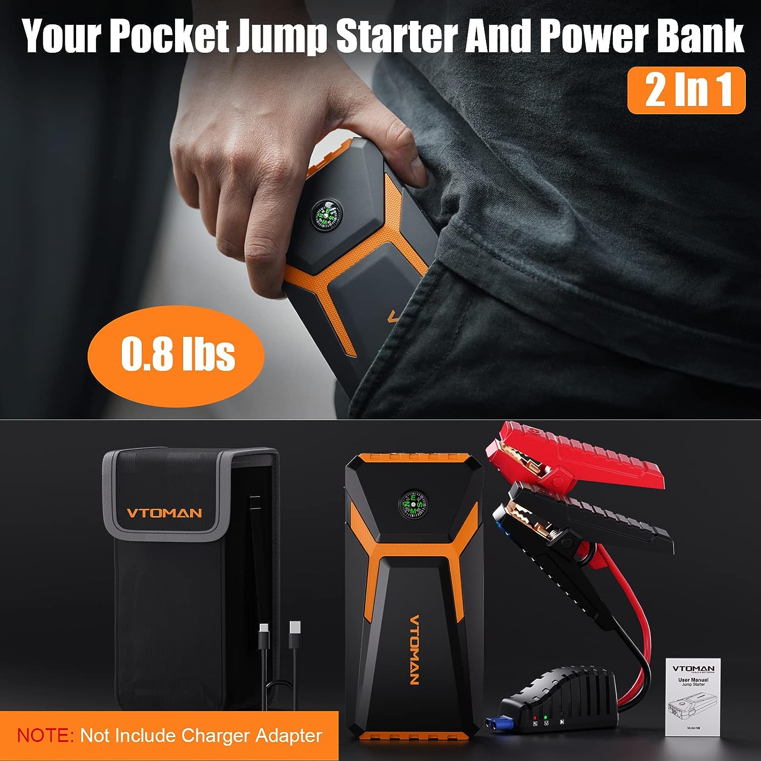 • [Lightweight And Stylish Design] The V6 car battery charger jump starter power pack weighs just 0.8 pounds and measures 6.8x3.3x1.2 inches. You can easily handle it, or put it in your pocket, or take it with you. In addition, the V6 portable car battery jump starter is also equipped with a compass to provide you with directions. Great thing to keep in your car just in case!