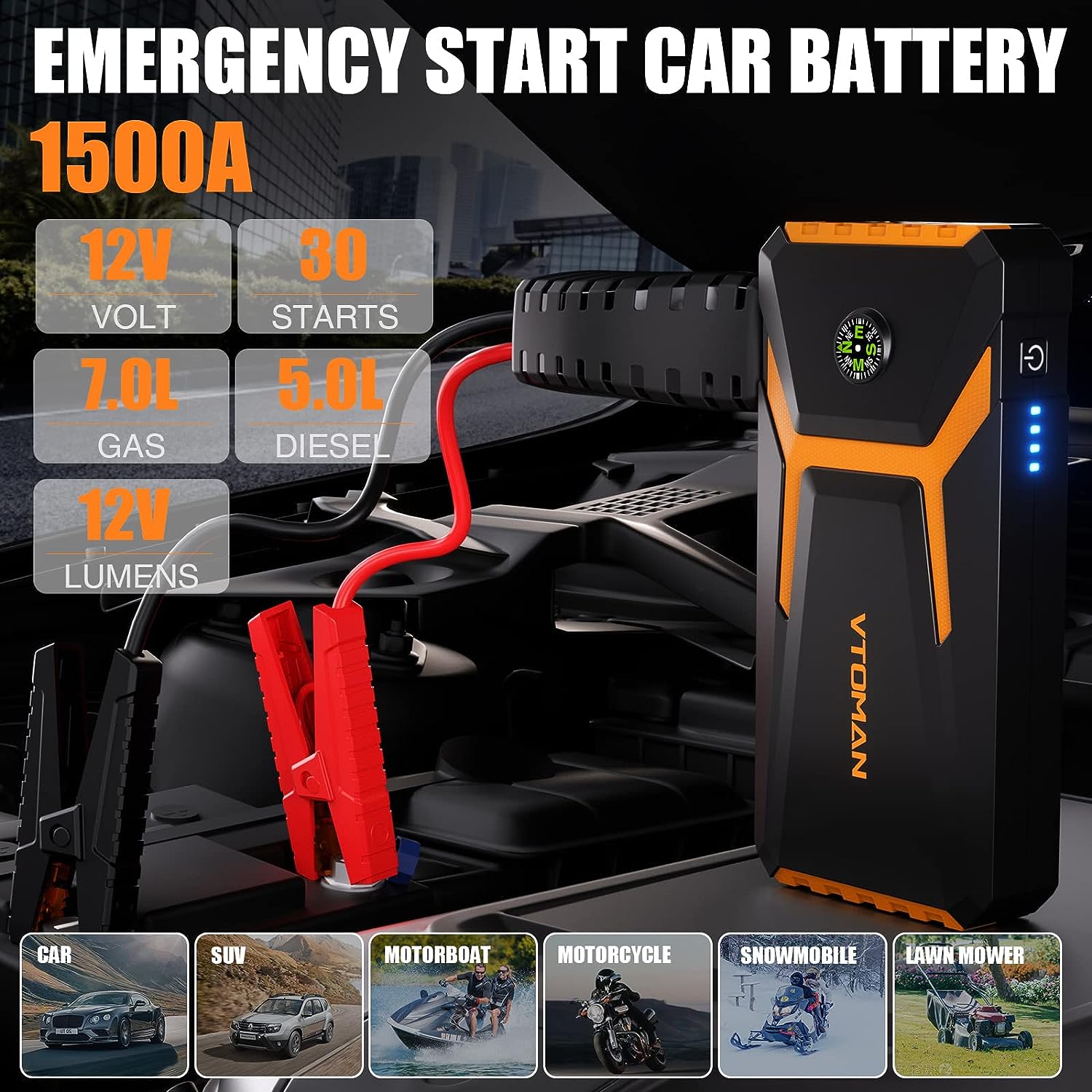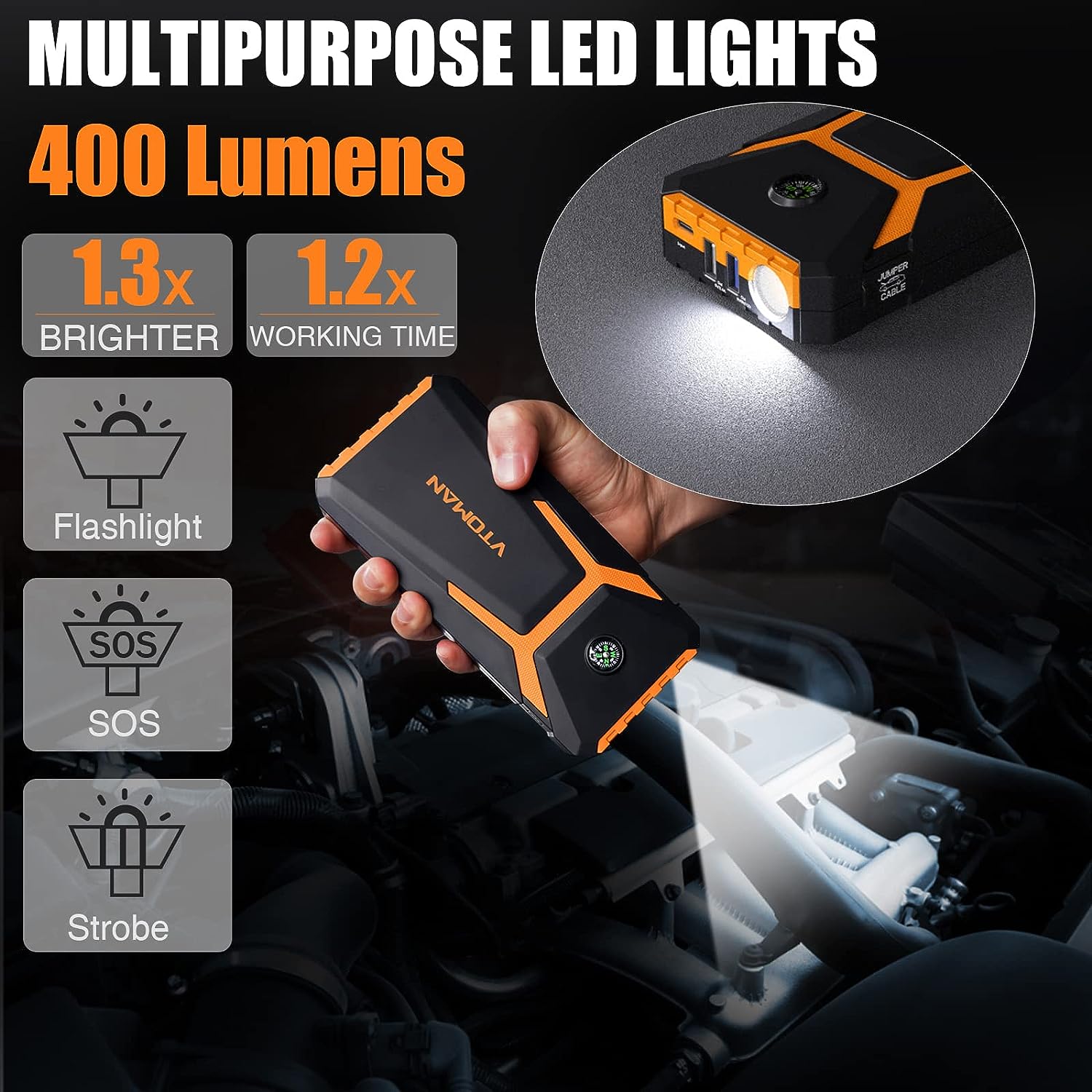 • [More Than A Jump Starter] The V6 battery jump starter box provides a Type-C input port for PD 15W fast charging, and it only takes 3 hours to charge from 0% to 100%. And the jumper box for car battery is designed with 2 USB outputs (5V/2.4A) and (5V/9V/12V), which can power various electronic devices. Finally, the V6 jump pack is also equipped with three modes of 300 lumen LED lights (Normal, Strobe, SOS) which can be used during outdoor adventures and field rescues.