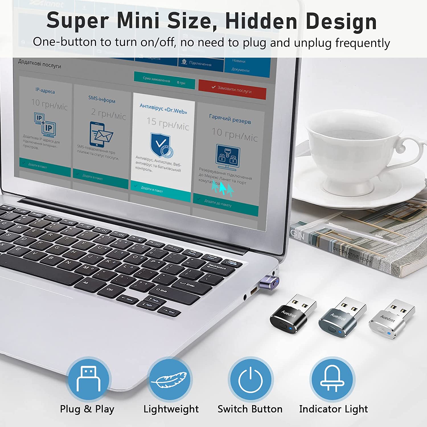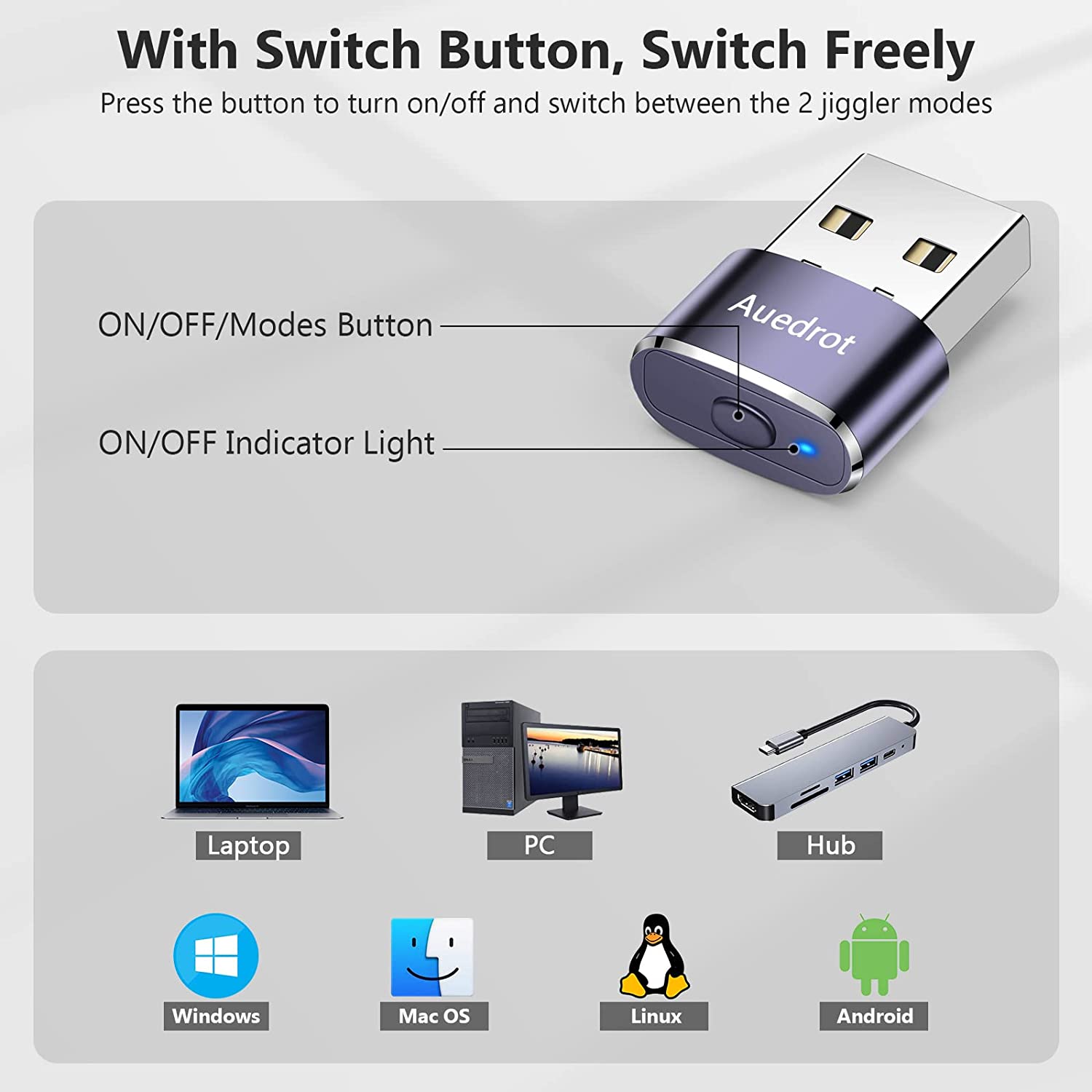 • [METAL MATERIAL WITH SWITCH BUTTON] -- This mouse jiggler is made of aluminum alloy, which is more upscale and sturdy than plastic. With the on/off/modes switch button, "Short Press" to turn on/switch between "Slight Jiggler Mode" and "Random Jiggler Mode", "Long Press" to turn off. The indicator lights on/off indicating that the mouse jiggler is turned on/off.