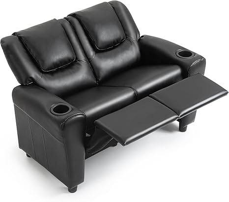 AVAWING Kids Recliner Chair, Double PU Leather Kids Loveseat w/Cup Holder, Lounge Sofa Chair w/Adjustable Footrest & Headrest for Boys Girls 3+ Age Group, Black