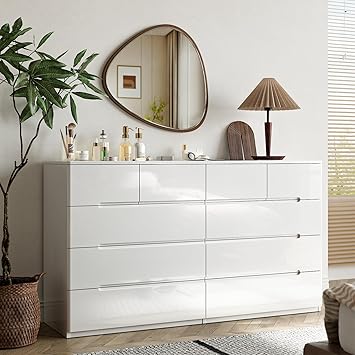 10 Drawer Dresser, White Dresser for Bedroom, High Gloss Modern Dresser & Chest of Drawers, 55" Long Dresser TV Stand, Large Double Dresser for Bedroom