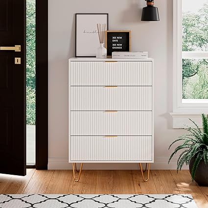 4 Drawer Dresser, Drawer Chest, Tall Storage Dresser Chest Cabinet Organizer Unit with Metal Legs, Small Dresser for Bedroom, Living Room, Closet, Hallway White Stripe