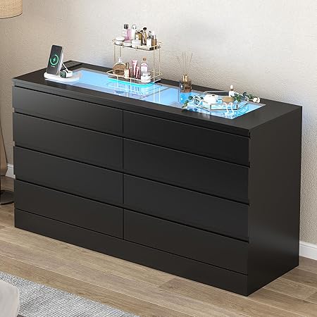 8 Drawer Dresser with Power Outlet, White Dresser for Bedroom Chest of Drawer with Glass Top & LED Light, Modern Double Wide Drawer Organizer Cabinet for Living Room (Black)