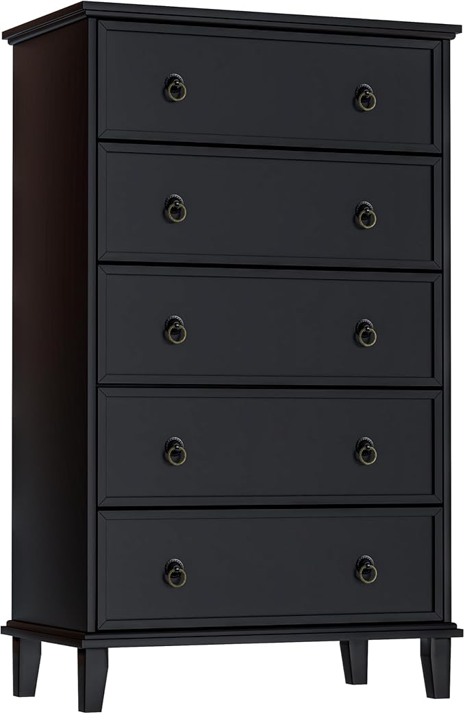 Black Dresser for Bedroom, Chest of Drawers Tall 5 Drawers Dresser, Wooden Storage Dresser with Three-Level Silent Drawer Slide for Living Room, Hallway