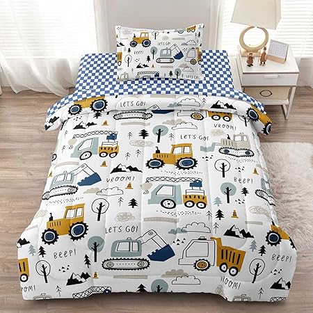4-Pcs Construction Twin Size Boys Bedding Set, Kids Comforter Set for Teens w/Sheets and Pillowcase, Soft Cartoon Tractor Cars Bed in a Bag Sets