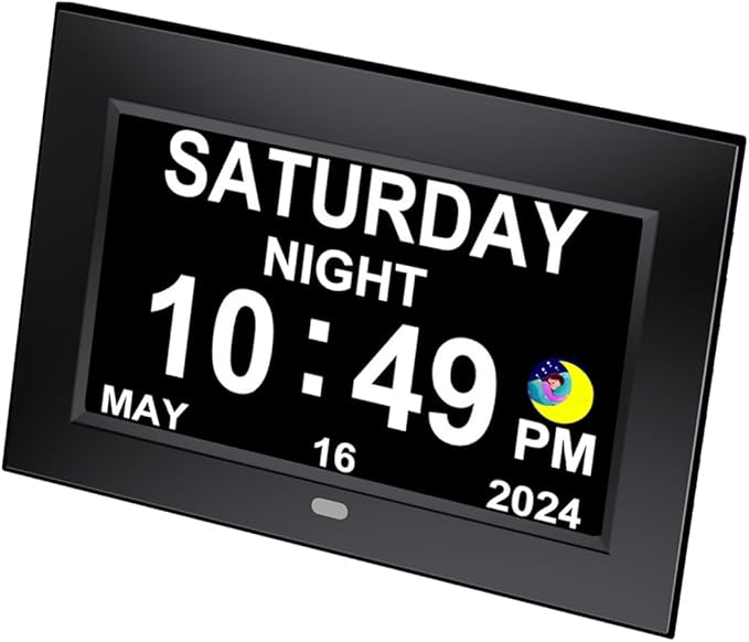 Alarm Clock With Day And Date For Elderly 7inch Digital Calendar Clock Photo Frame- Auto Dimmable Display 15 Alarm Options, Clock With Non-Abbreviated Day & Month