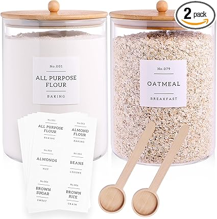 2 Pcs Large Jar with Lid for Kitchen Counter with 132 Pantry Labels and Spoon, Glass Canister Food Storage Container, Flour Container, Kitchen Storage Jars for Candy, Cookie (100oz X 2)