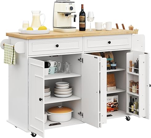 58" Mobile Kitchen Island with Power Outlet, Kitchen Island Cart with Storage Cabinet, Kitchen Rolling Island with Spice Rack, Towel Rack, Drawers, Knife Holder, Island Table for Dinning Room