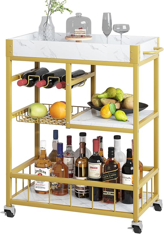Bar Cart 3 Tiers Removable Storage Tray with Wine Rack & Basket Tier, Rolling Beverage Cart, Mobile Bar Serving Cart with Handle, White Marble Wood and Gold Frame Home Kitchen Shelf for Party