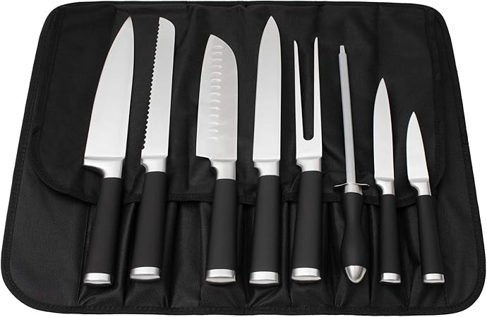9-Piece Kitchen Knife Set in Carry Case - Ultra Sharp Chef Knives with Ergonomic Handles - Professional Japanese Chef's Knife Set with Paring, Carving, Bread, Santoku, Utility Knives, Fork, Sharpener