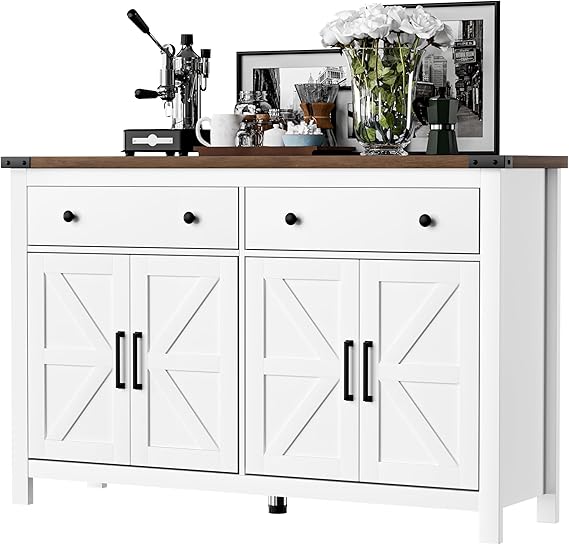 55" Sideboard Buffet Cabinet with Storage, Coffee Bar Cabinet with 2 Drawers and 4 Barn Doors, Long Storage Cabinet Modern Farmhouse, White Wood, for Kitchen, Dining Room, Living Room