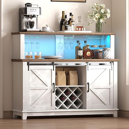 AMERLIFE 55" Farmhouse Coffee Bar Cabinet with LED Lights, Buffet Cabinet with Storage & Wine Racks, Home Liquor Cabinet with Adjustable Shelves & Sliding Barn Doors, Rustic White