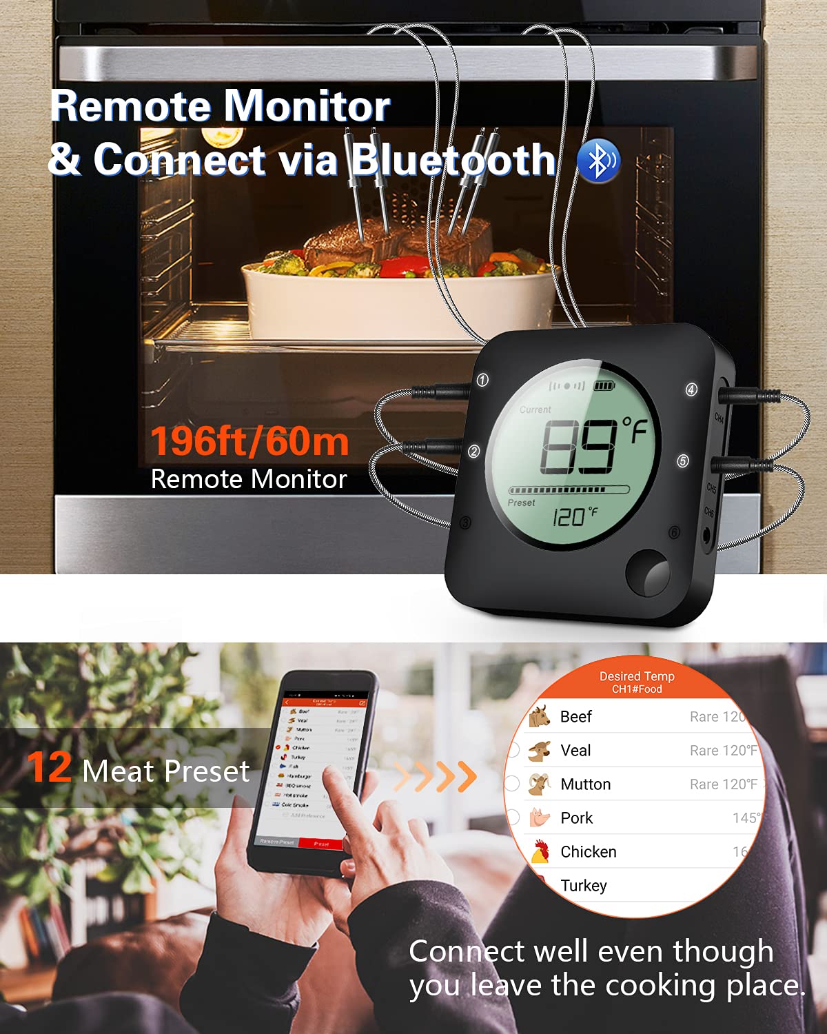 • 【6 Channel Probes 】The Bluetooth meat thermometer is equipped with 6 stainless steel probes. It can monitor up to 6 different foods at the same time. each probe has a heat-resistant (662 ° F) aluminum alloy handle that can be safely used in ovens and grills.