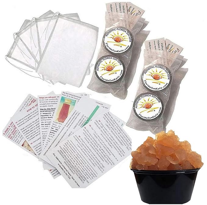 4 PORTION Cups - Makes Gallons of Original Florida Sun Kefir Water Kefir Probiotic Scoby Grains (6) SIX Brewing Bags