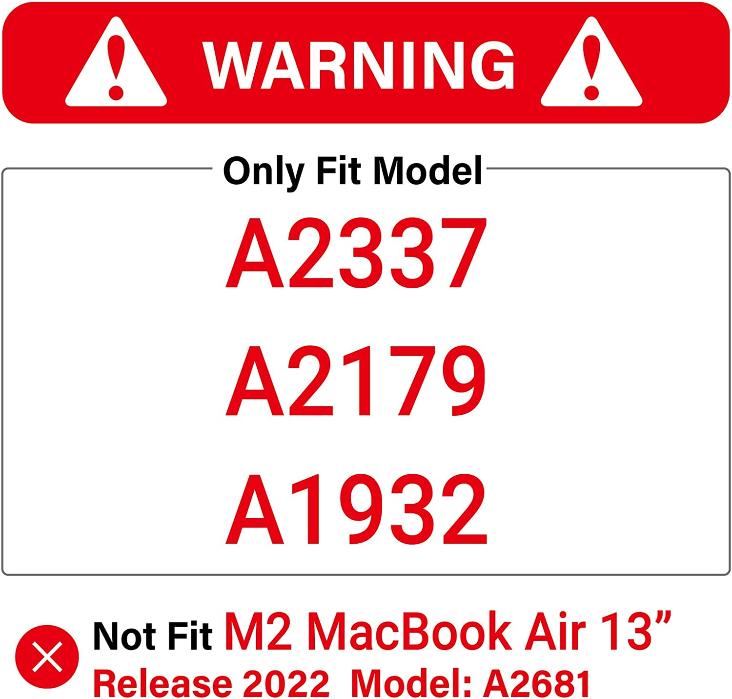 • ❌【Not Fit】 - This case is NOT compatible with 2022 M2 MacBook Air 13 Inch (The latest Model: A2681) and Older MacBook Air 13 Released BEFORE 2018 (Models: A1466/A1369). Please kindly check the model number at the bottom of your laptop(A****)