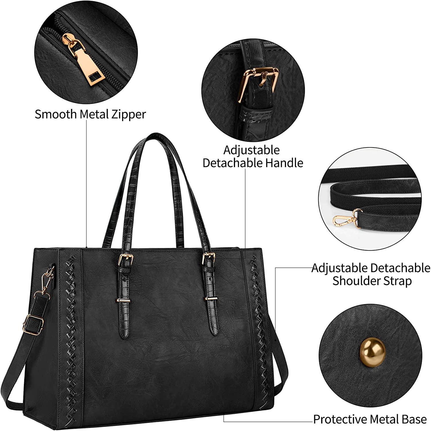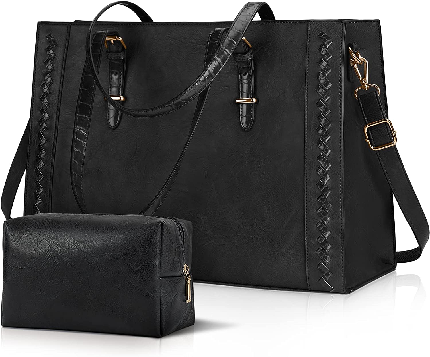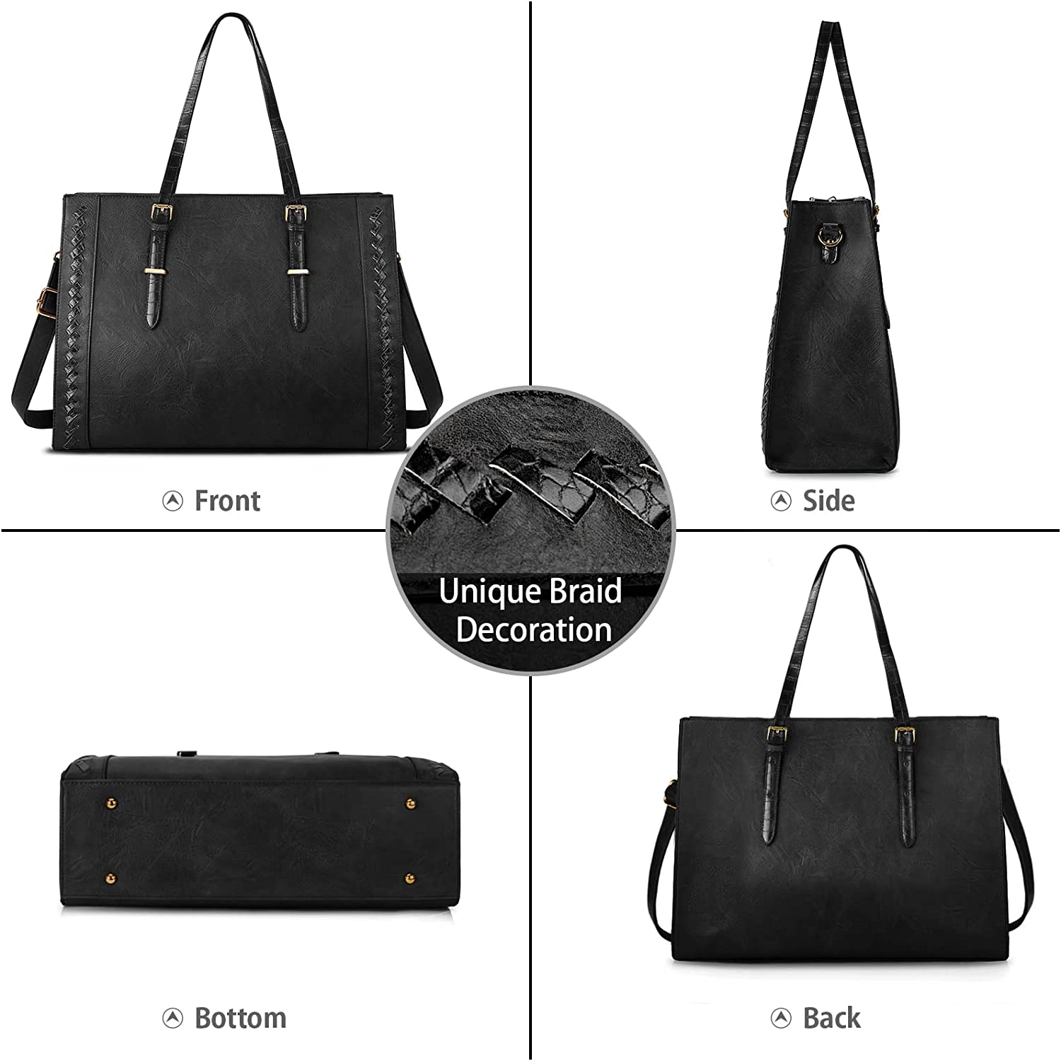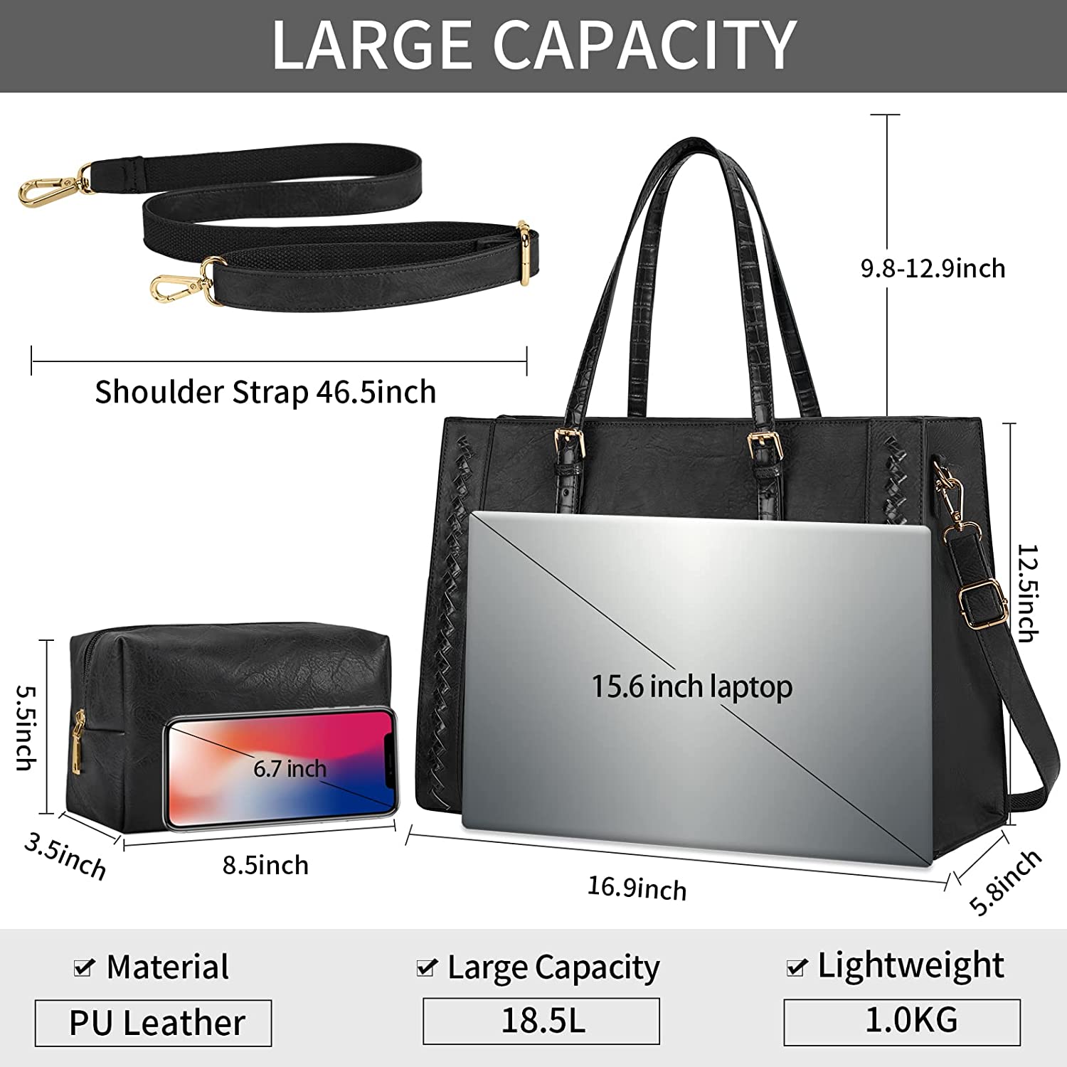 Laptop Bag for Women 15.6 inch Large Leather Tote Bag Waterproof Computer Tote Bag Professional Business Office Briefcase Handbag Shoulder Work Bag Purse 2pcs Set Black