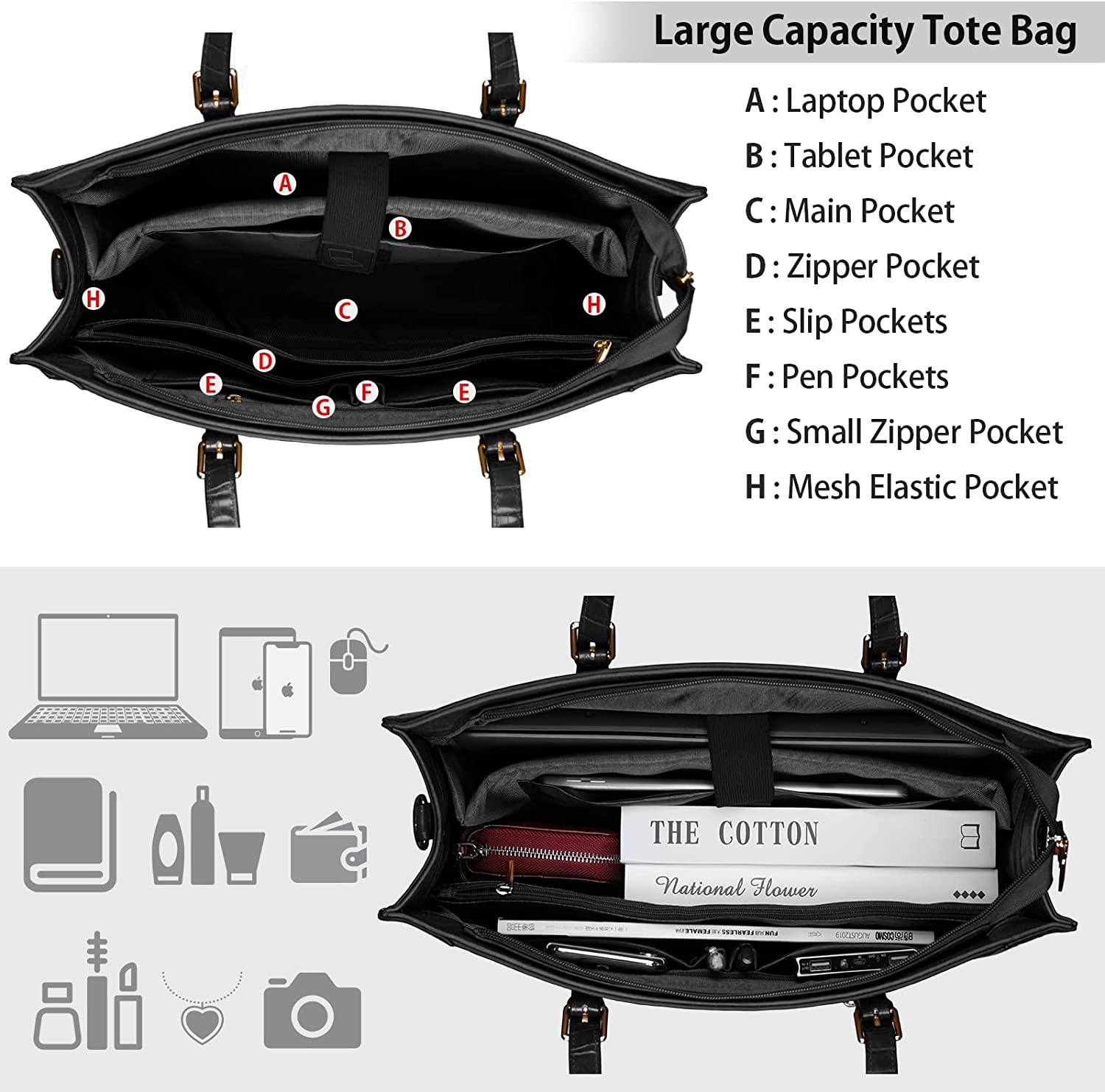• Laptop Bag For Women: This laptop tote bag divided into three sections, 1 main padded pocket design for 15.6 inch laptop, and 1 iPad pocket provide a thick padded foam section with a velcro strap closure to fully protect your laptop against accidental impacts and scratches, 2 open big pockets for documents and books. 1 large zipped pocket for your private belongings, 2 slip pockets and 2 pens pockets, and 1 small zipper pocket for stock your ID card and wallet etc.