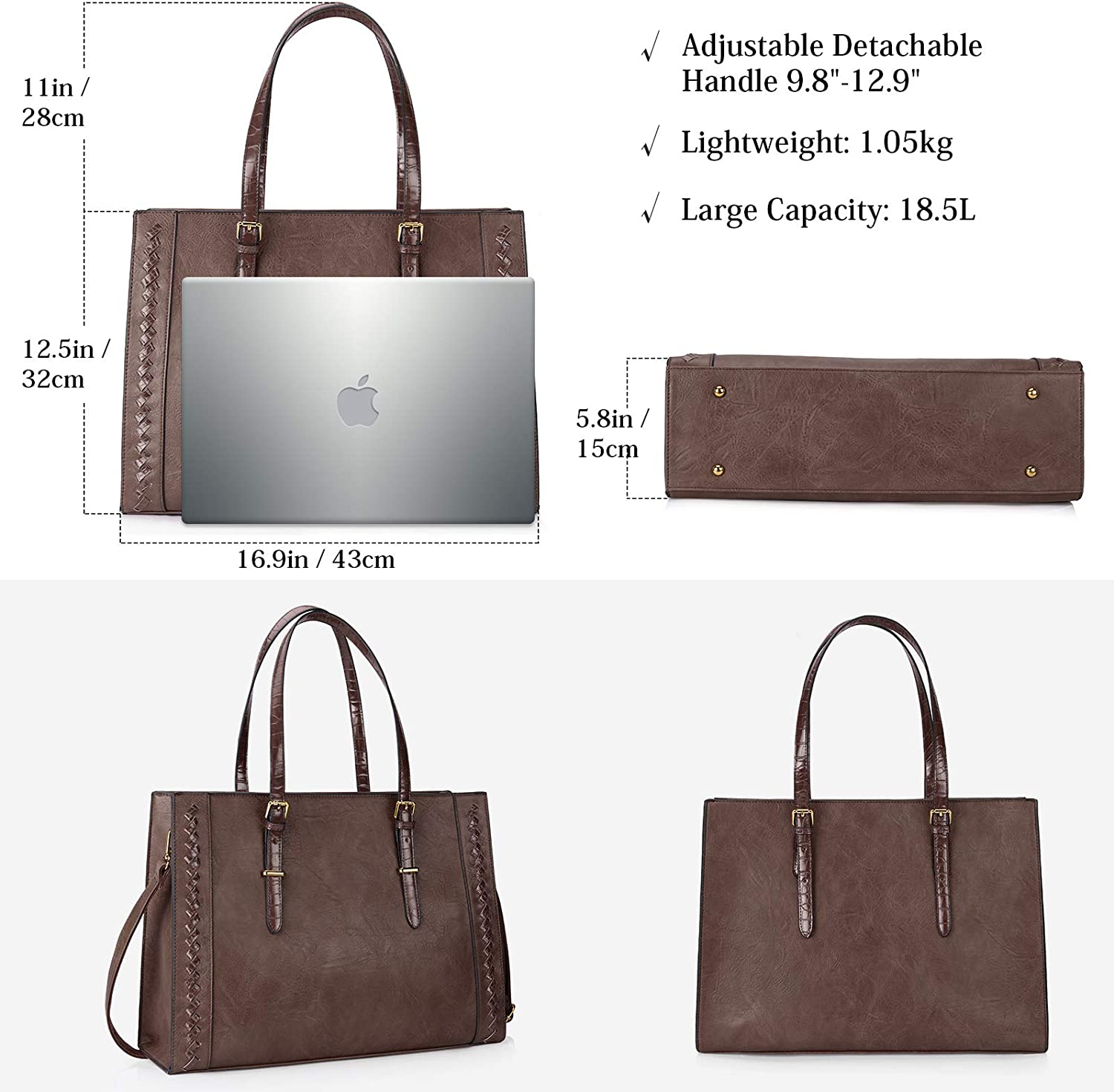 • Perfect Size Laptop Tote Bag: Size of the tote bag is 16.9"x5.8"x12.5", finished with a secure zip-top closure. Extremely lightweight just 1.05kg,it's a universal size so it fits all 13-15.6 inch laptops. The smooth leather adjustable handles and detachable strap provide a variety of carry options,as a lightweight briefcase , handbag, shoulder bag or a crossbody bag as well, offers the perfect combination of elegance and practicality for every day.