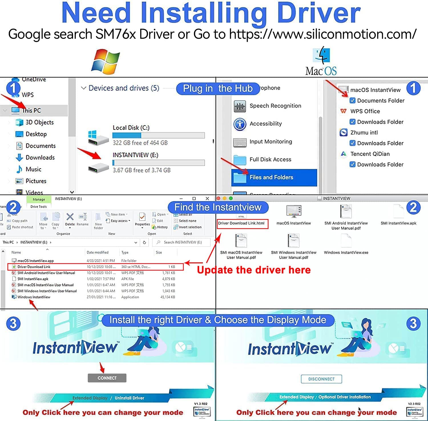 • ❤PLEASE LET US KNOW IF YOU CAN'T INSTALL DRIVER or CAN'T DETECT THE MONITORS.Turn a single USB-C/USB 3.0 port into 2 HDMI(1*HDMI 4K@30Hz and 1*1080P@60Hz) port and 3 USB 2.0 ports. The USB 3.0/USB C dual HDMI docking station lets you mirror or extend your display by adding two independent HDMI monitors.