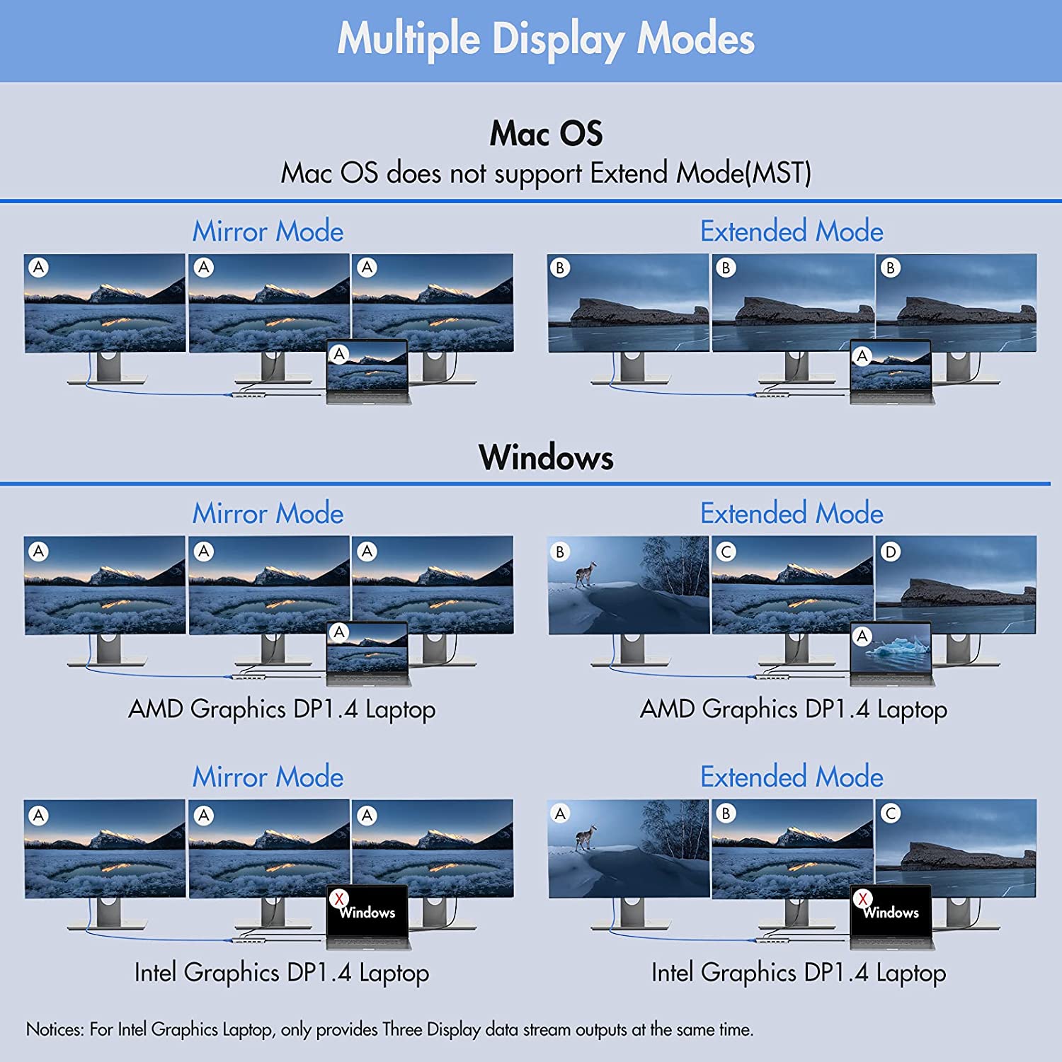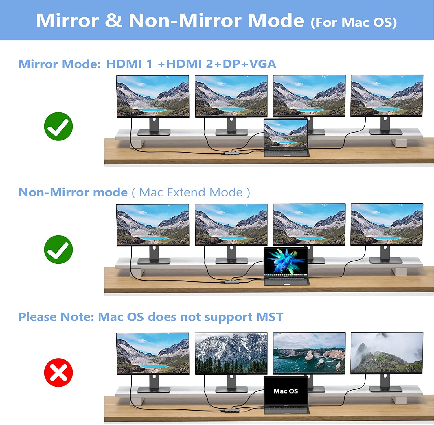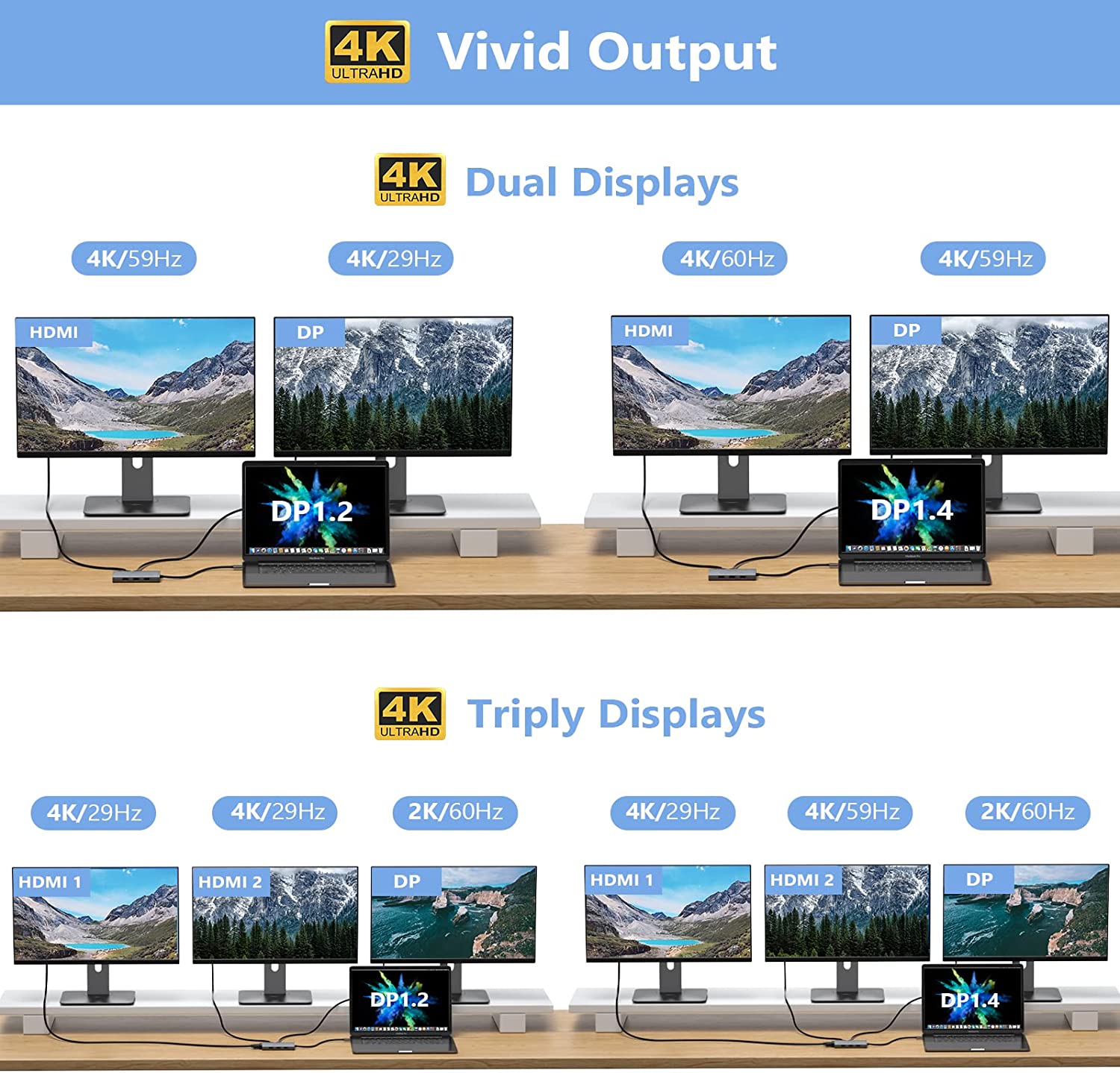 • 【Docking Station Dual Monitor with 2 HDMI(4K) & VGA】: This USB C Dock can mirror or extend your screen with the HDMI VGA ports, directly stream 4K UHD or Full HD video to HDTV; HDMI1 can up to 4K 60Hz under DP1.4 source; And resolution up to 2*4K@30hz or 4K+2K@60hz when simultaneously connect dual hdmi; For triple display the resolution up to 1080P when simultaneously use under DP1.4 source.★Notices: Only Windows OS support MST,MacOs only support SST mode,all external screens will be the same.