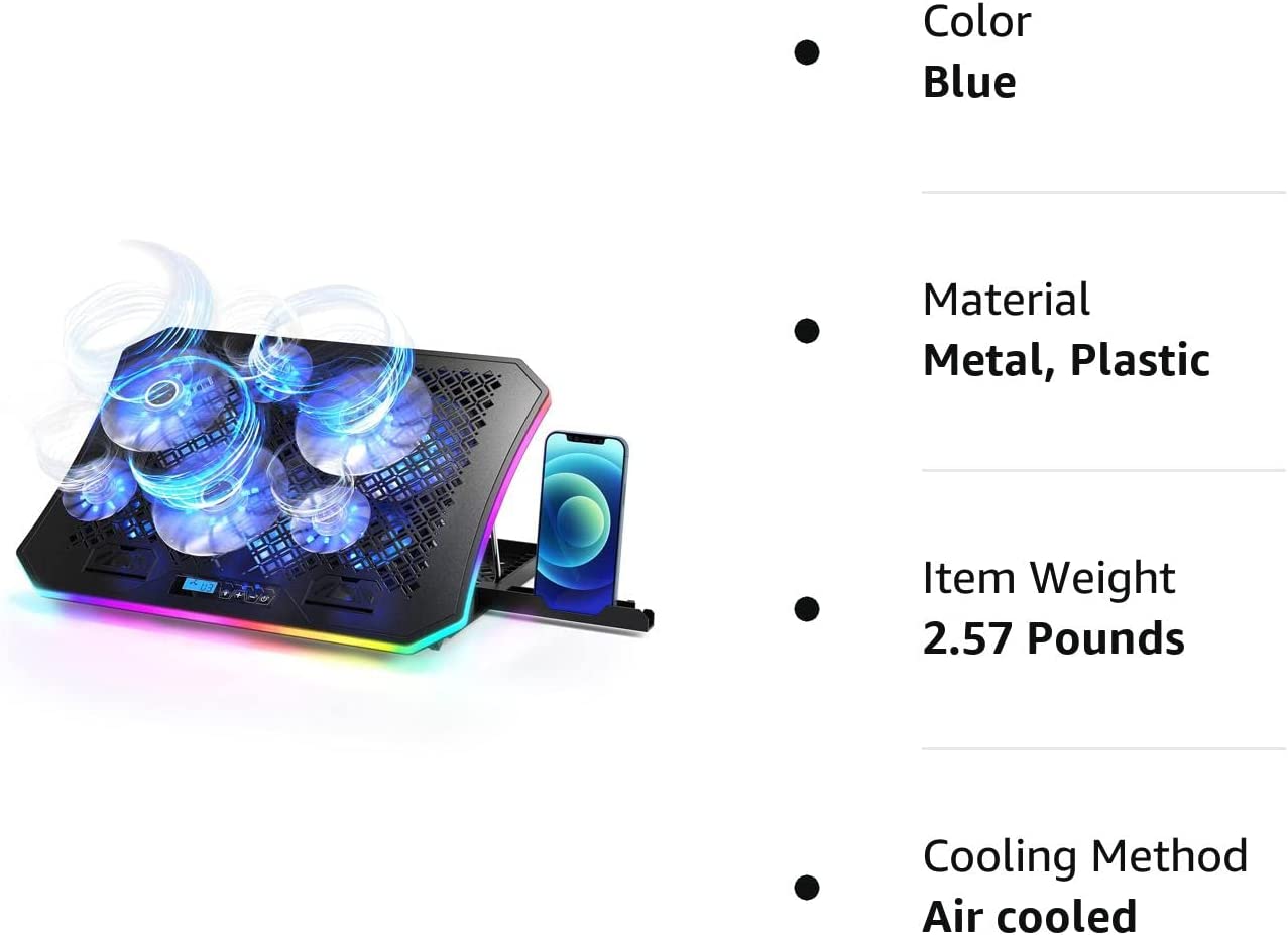 KeiBn Upgarde Laptop Cooling Pad, RGB Lights Laptop Cooler 6 Fans for 15.6-17.3 Inch Laptops, 7 Height Stands, 10 Modes Light, 2 USB Ports, Desk or Lap Use (A8,Blue)