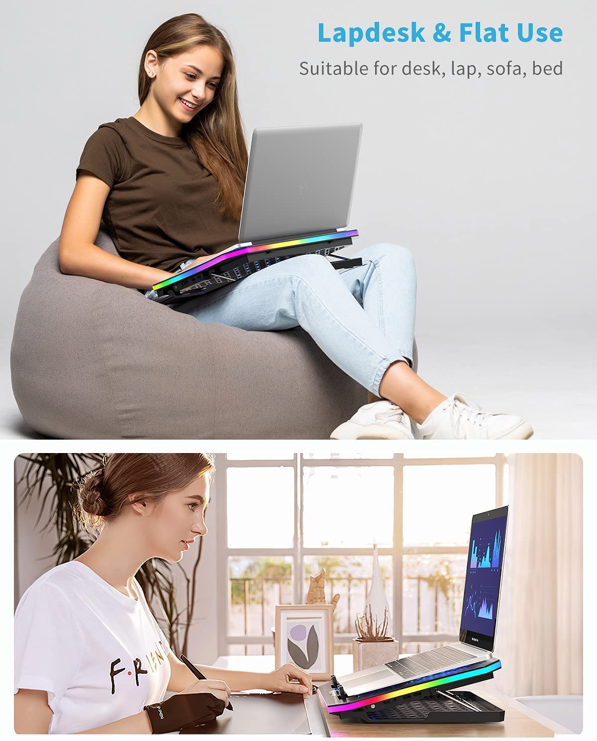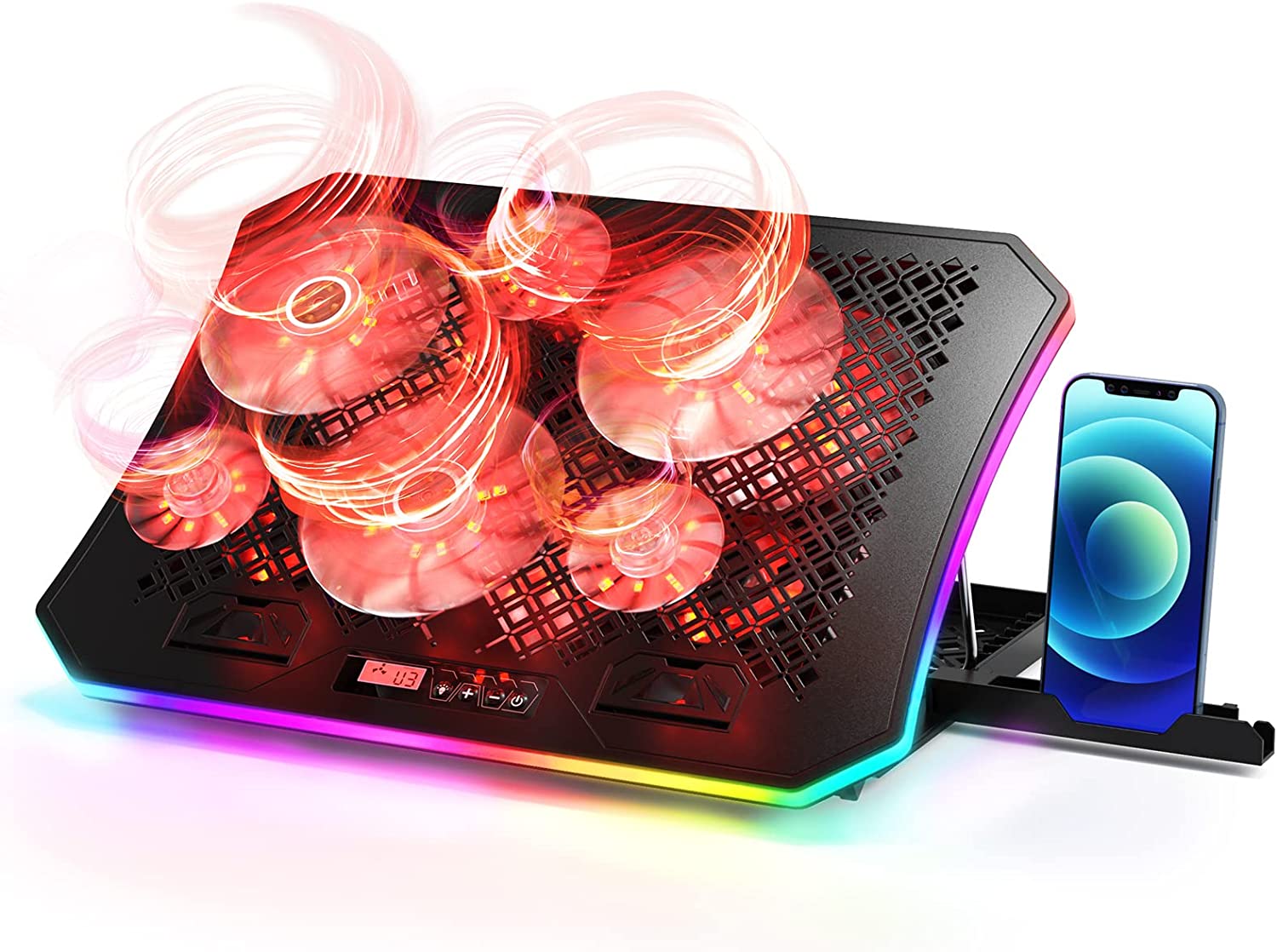 • Ergonomic Height Stands - This rgb light cooling pad for a laptop has 7 different height settings, which allows you to adjust a comfortable posture from 16 degrees to 35 degrees, raising your laptop 4.3" to 7.5" high. Weighs 2.57 lb, it is lightweight to carry with you. Relieve pain your shoulder and spine, guide you a healthy lifestyle