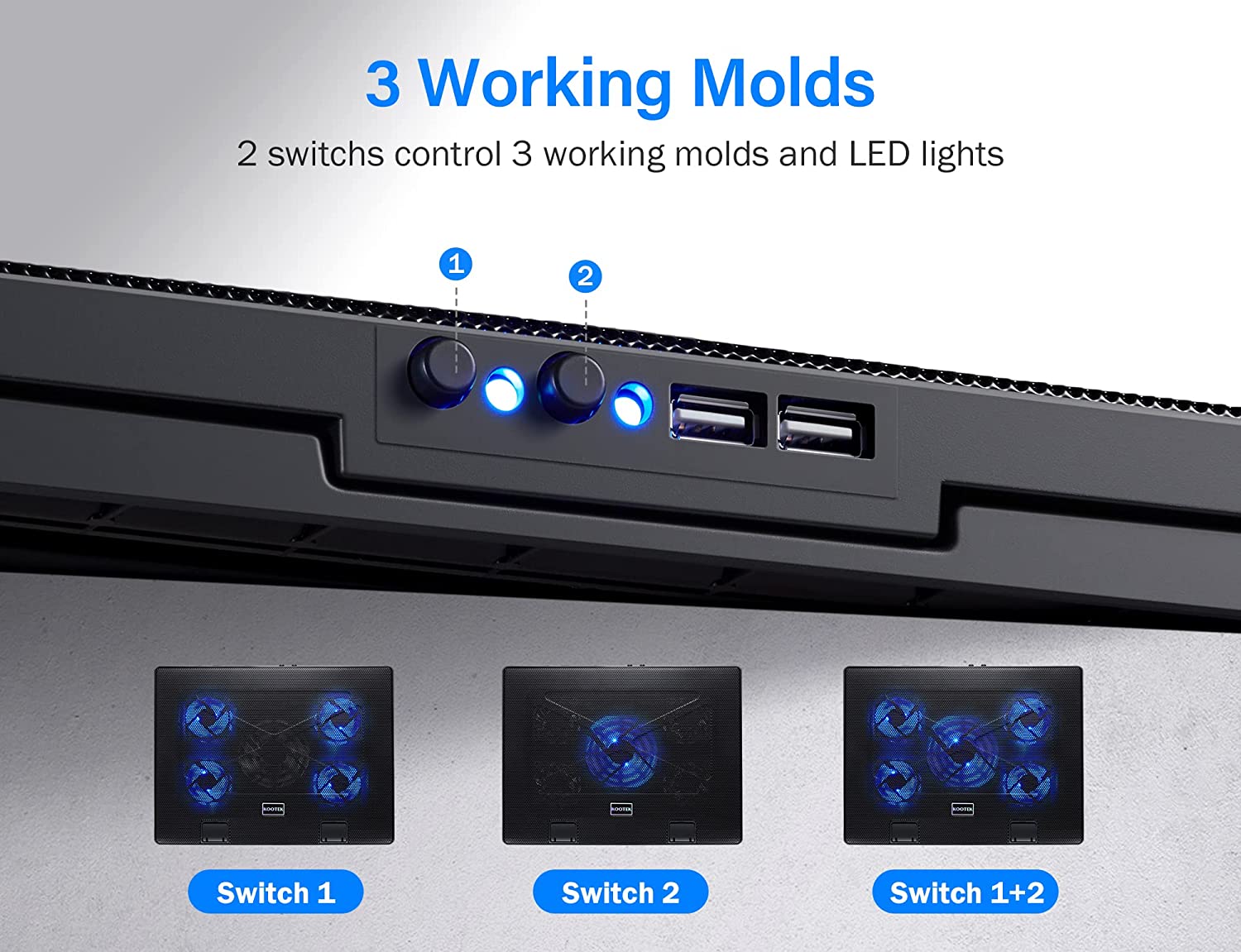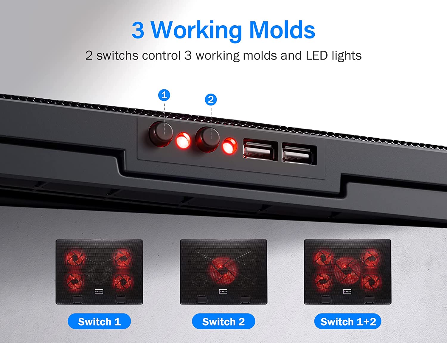 • 5 Built-in fans (big fan: 5.9-inch, small fans: 2.76-inch) with Red LEDs, two On/Off switches to control 5 fans and LEDs simultaneously. (Simply press the switch to select 1 fan working, 4 fans working, or all 5 working together.)