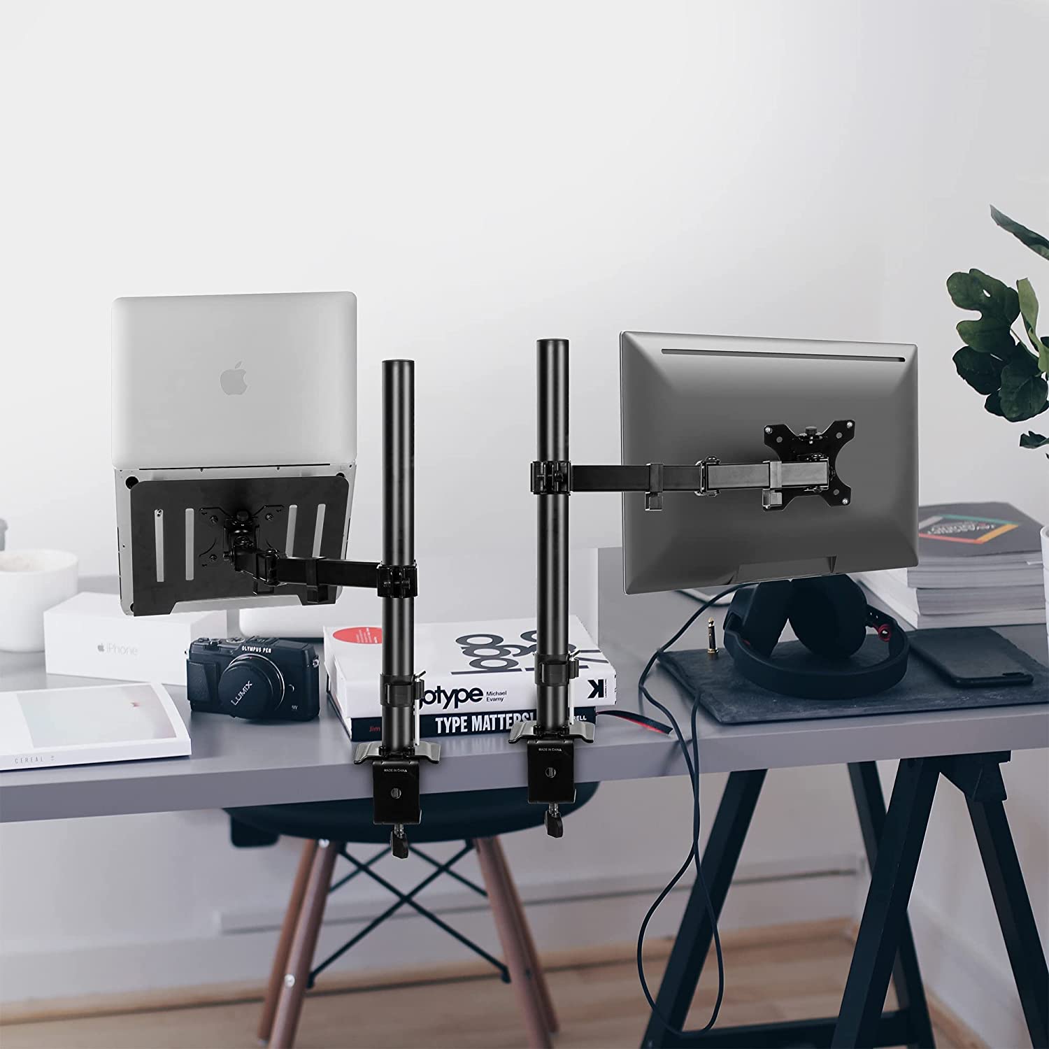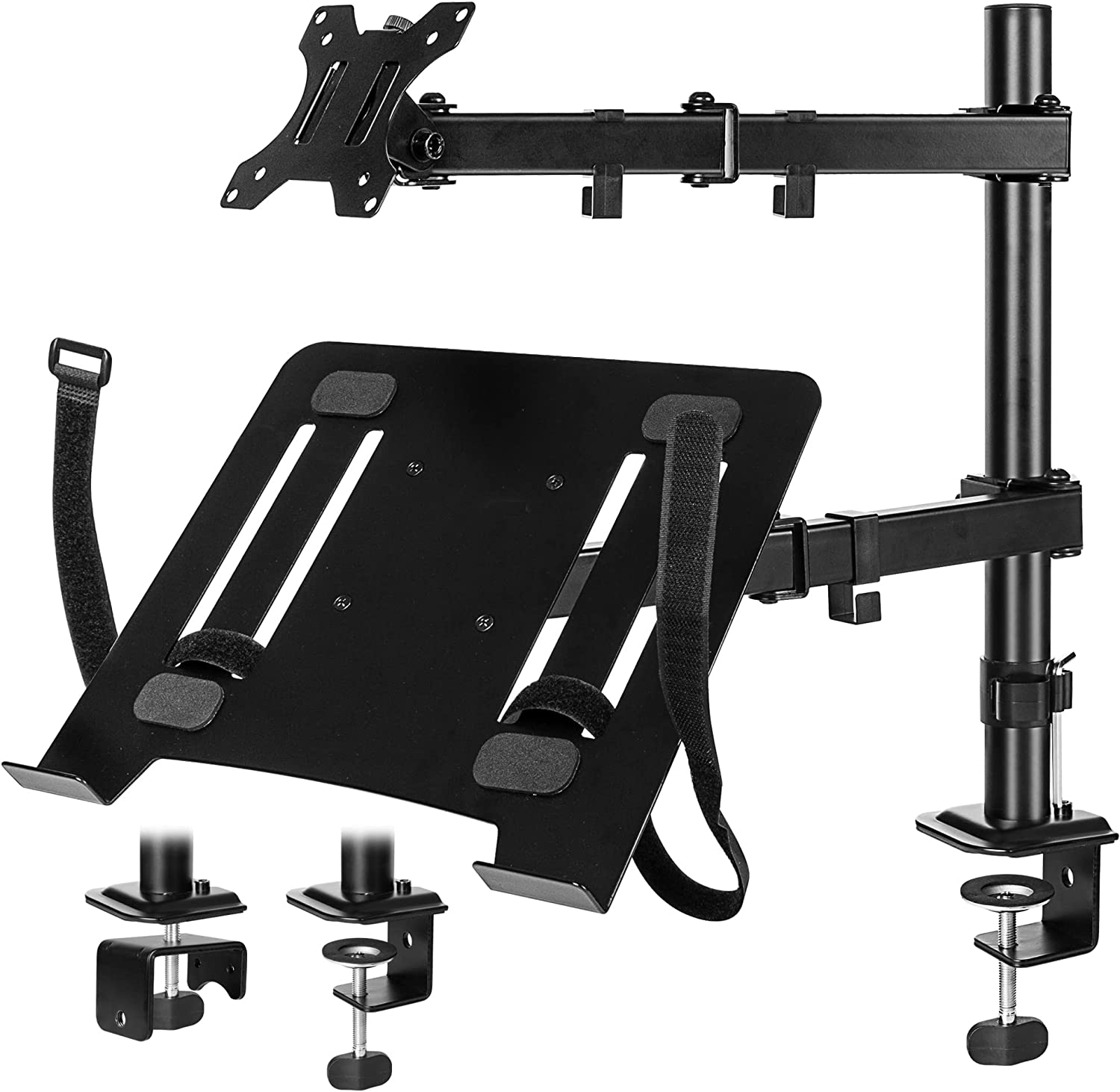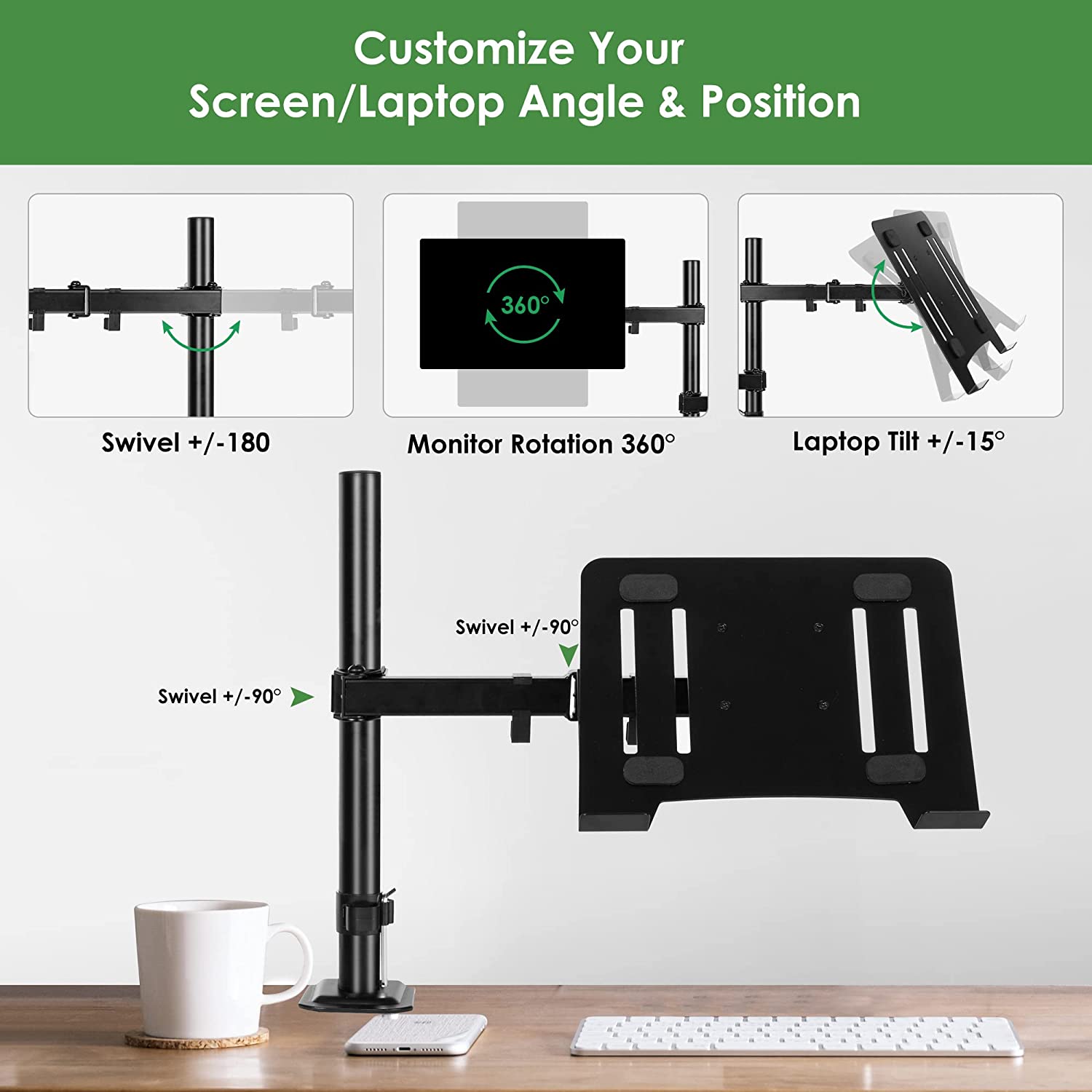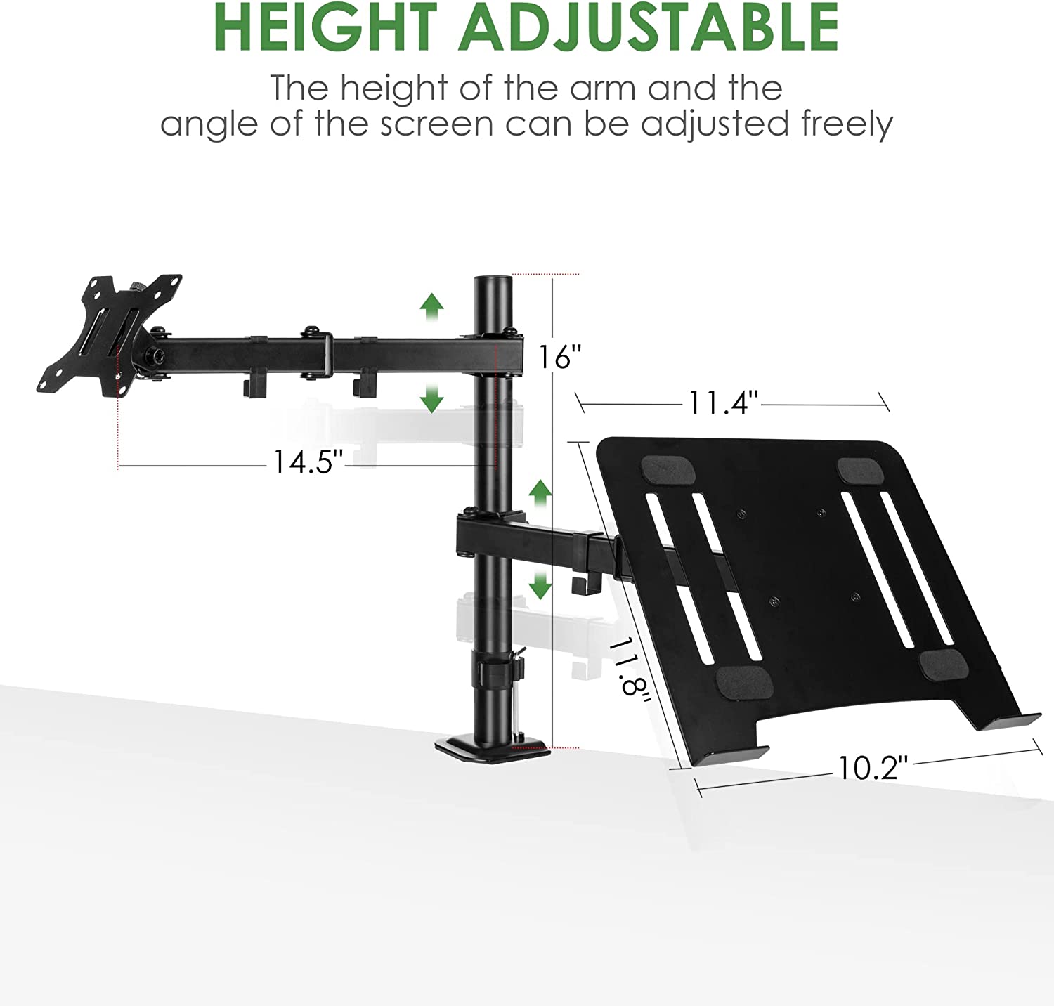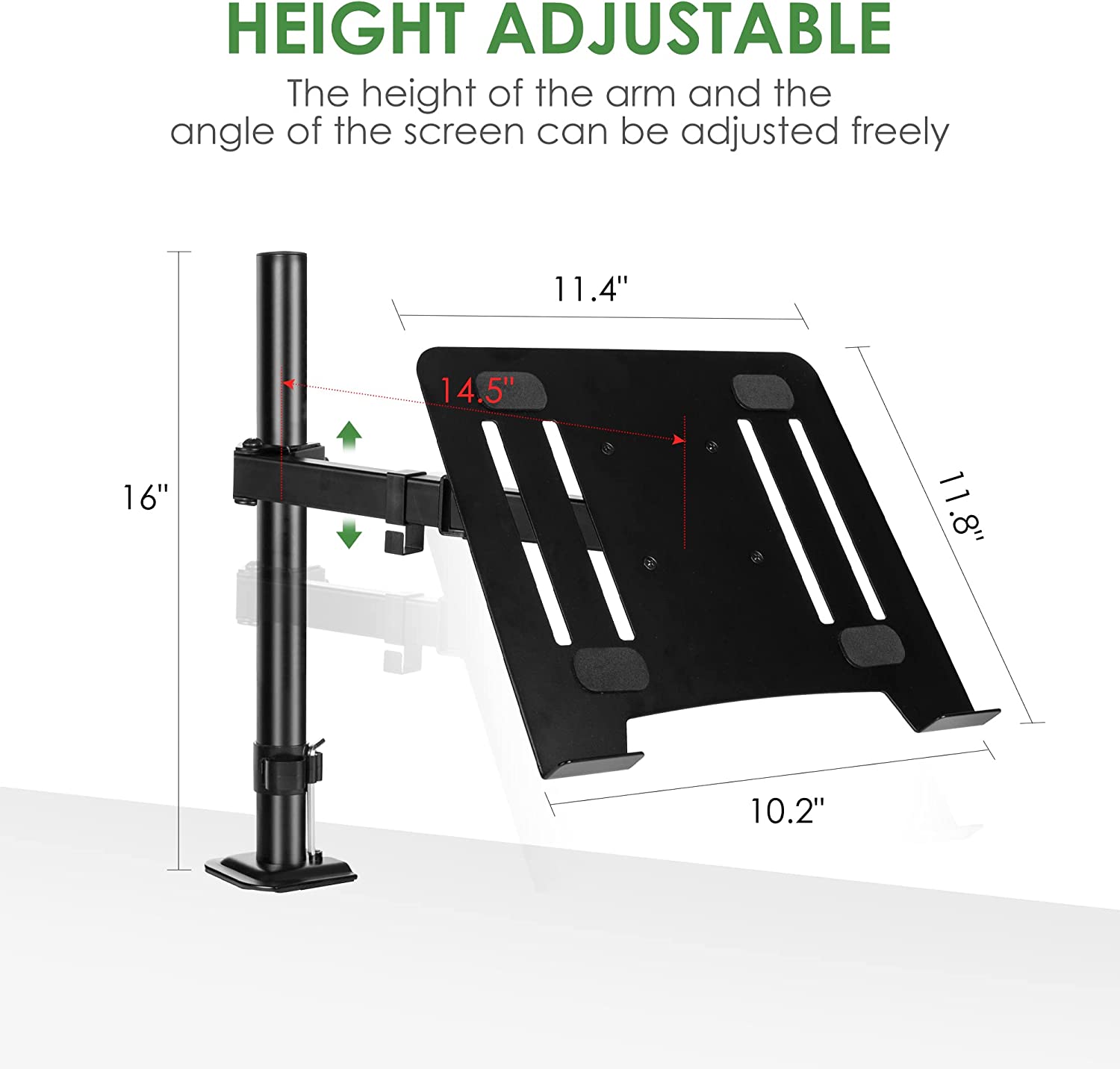 • Ergonomic Full-motion Monitor and Laptop Mount - The laptop monitor mount is full-motion and height adjustable. The arms easily tilt, swivel and rotate. Flexible arms can swivel 180° at each joint facilitating swing in and out of positions and extend up to 14.6" length.It offers -90°to +70° tilt, -90° to +90° swivel, 360° rotation, and adjustable height up to 16". With this laptop mount you can easily find the optimal view angle for more comfortable working.
