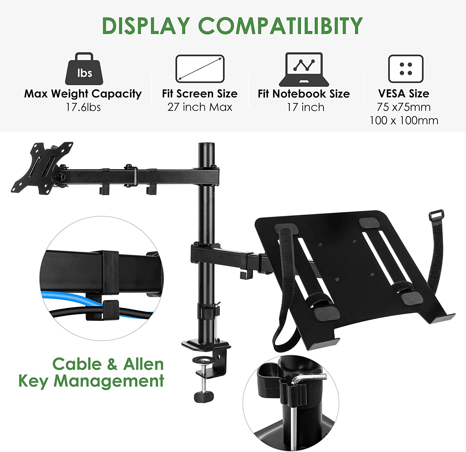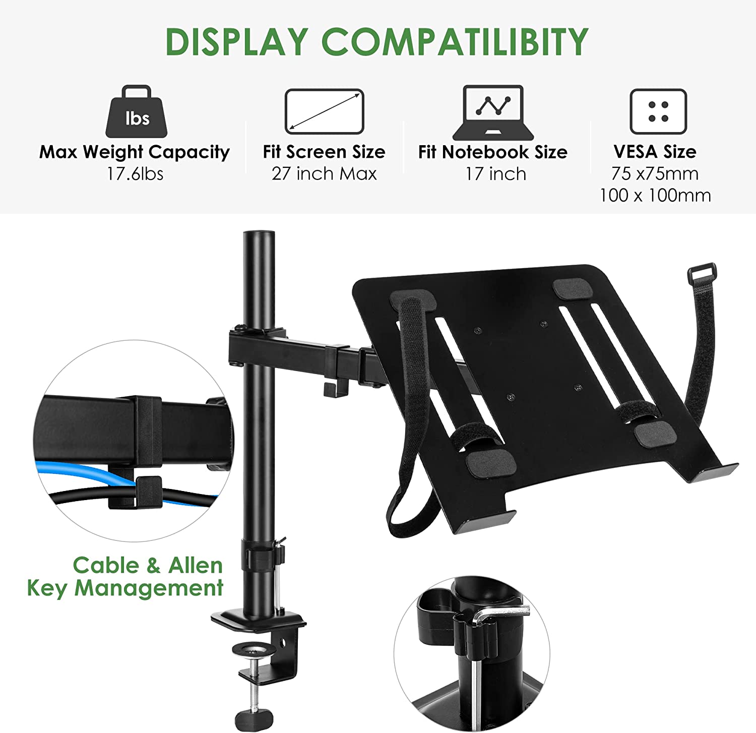 • Universal Monitor Mount Stand With Laptop/Notebook Tray - With an extra long 16" monitor arm for easy adjustment, this sturdy desk stand mount fits most 13"-27" LCD computer monitor screens up to 22lbs. Compatible with detachable VESA patterns 75 x75 and VESA 100 x 100mm. The vented steel keyboard tray measures 12" in length and 9.1" in width, perfect for laptops/notebook up to 17" in size 17.6 lbs in weight.