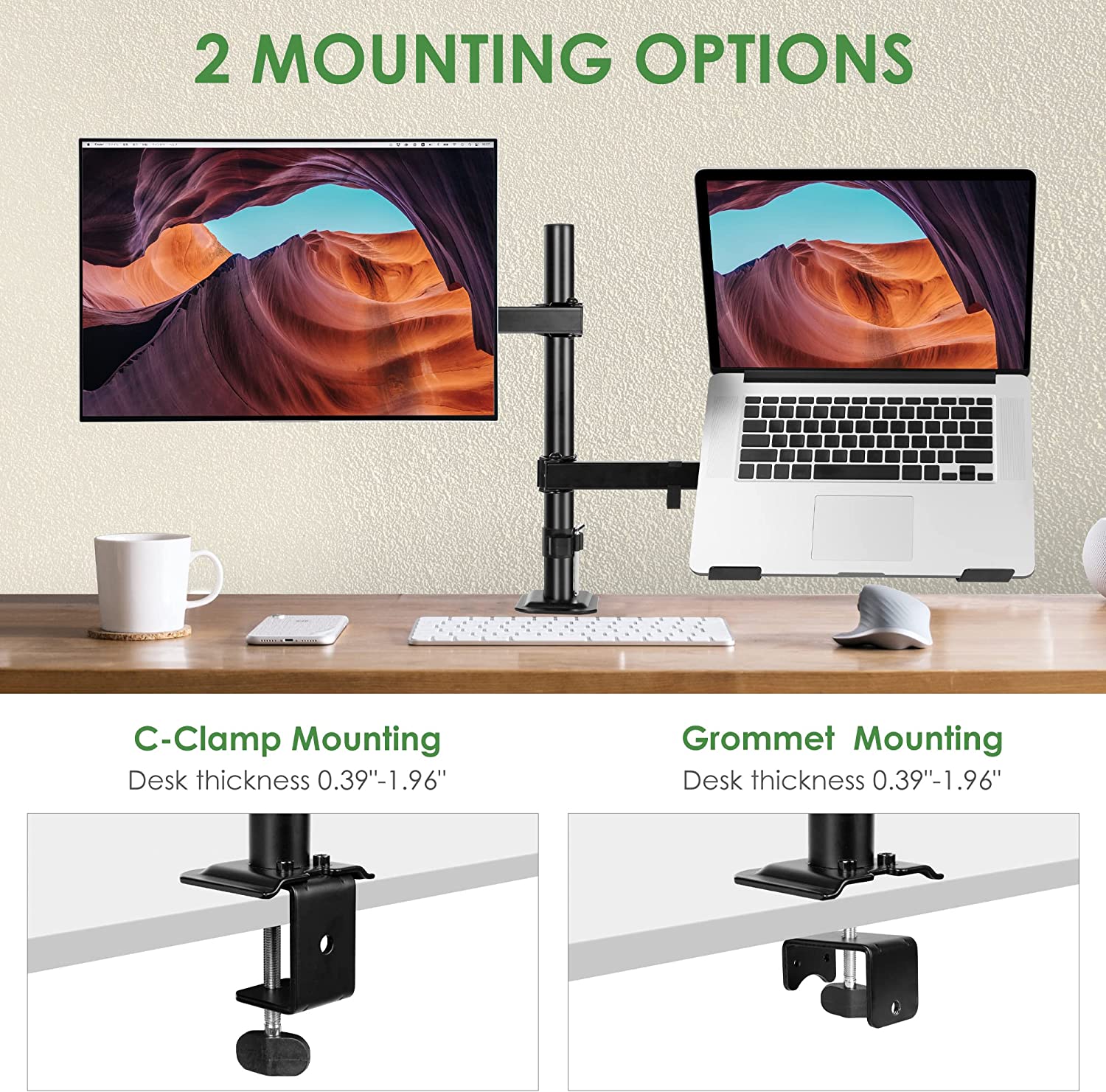 • Two Installation Options - Monitor arm with laptop stand comes with C clamp and grommet mounting kit. You can fix the laptop arm stand and hold your monitor by using the C clamp or if there is a hole on your desk, you can choose the grommet base mounting. The thickness of the desk for C-clamp mounting and grommet mounting is 0.39" to 1.96"