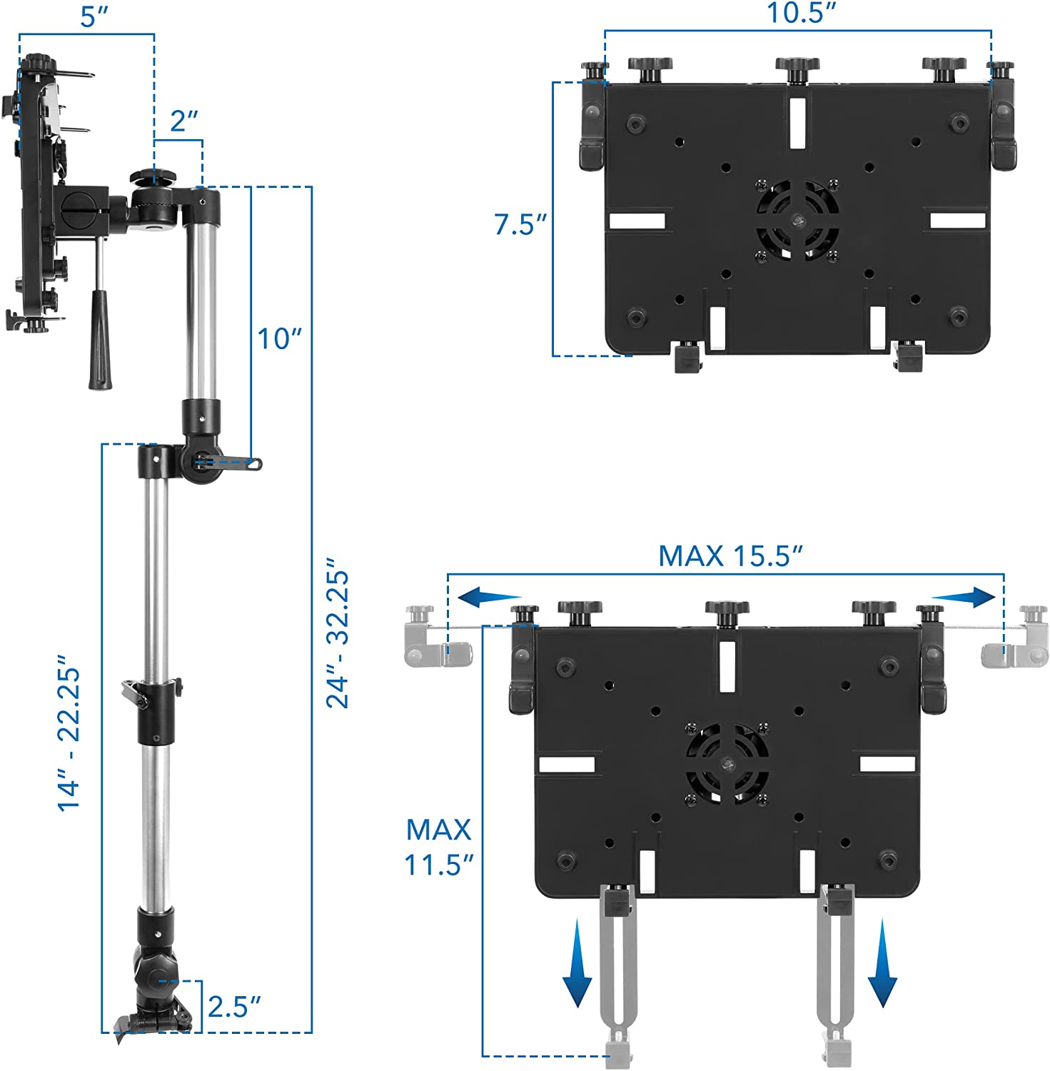 • Universal tray design fits various laptop models up to 17 inches in screen size. Four adjustable clamps securely hold the laptop on the tray. Tray can hold tablets as well.