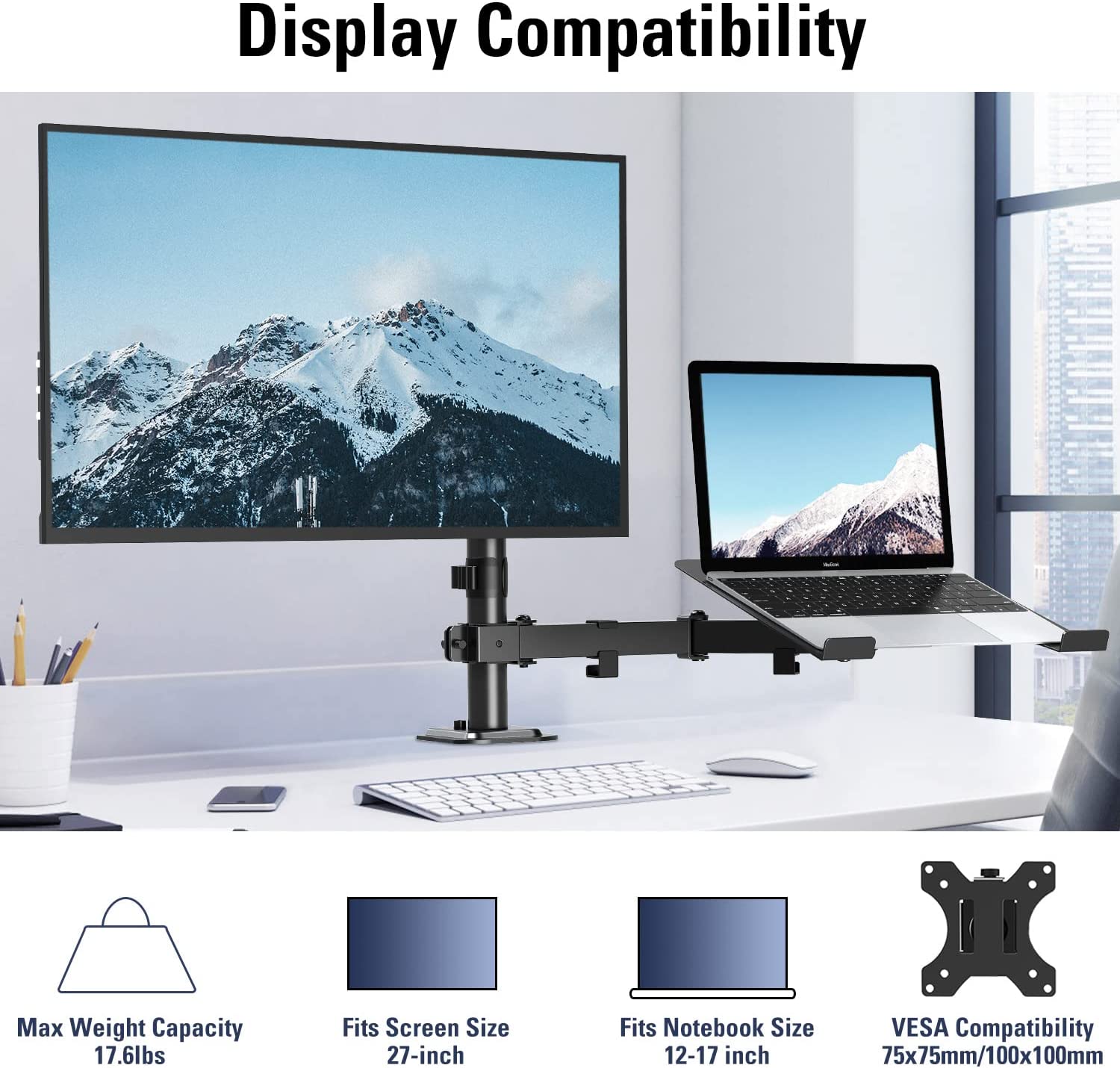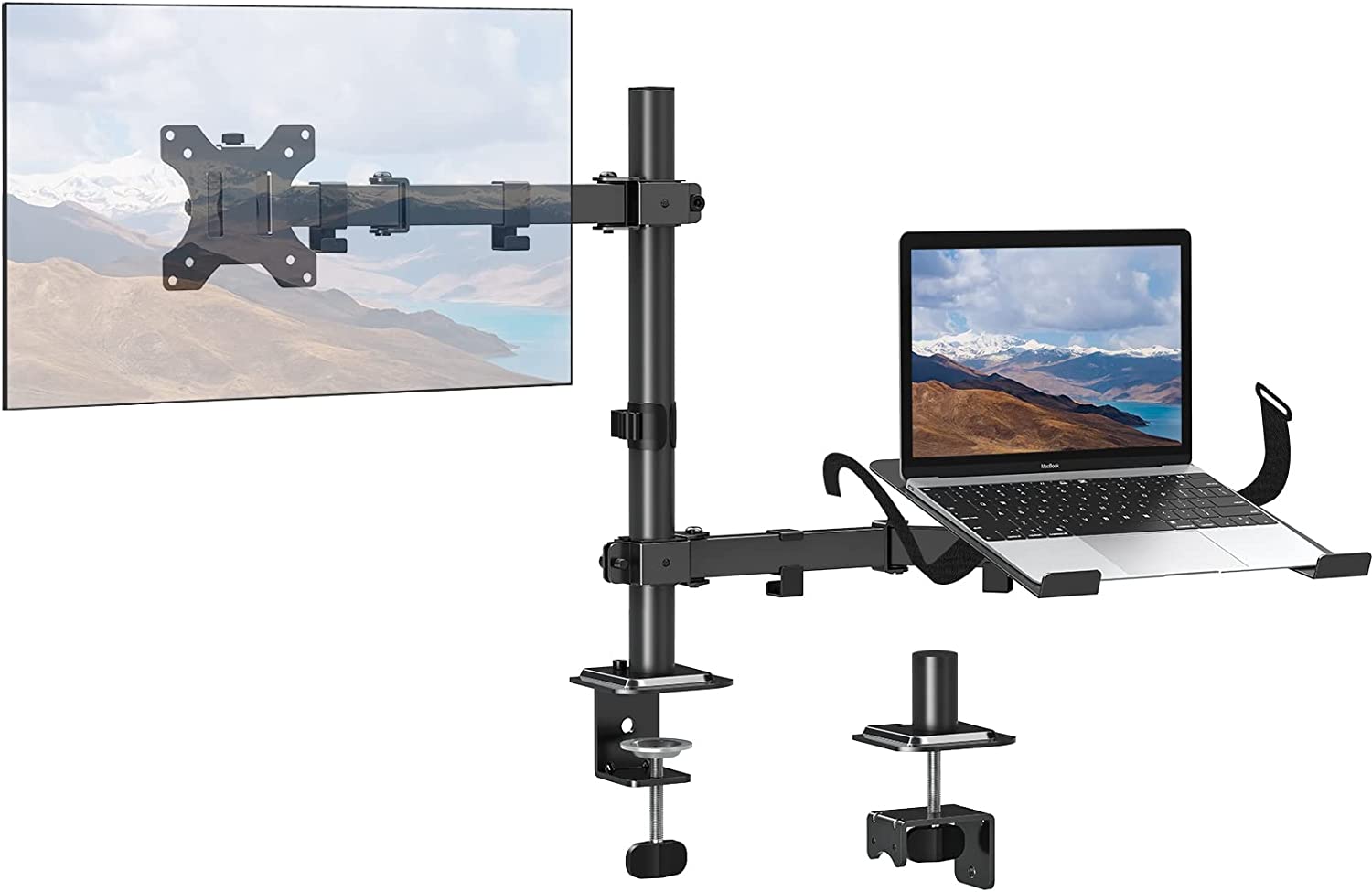 MOUNTUP Monitor Mount with Laptop Tray, Single Monitor Arm for 13-27 Inch Computer Screen, Laptop Mount for Max 17" Notebook, Desk Monitor Mount with C-Clamp and Grommet Base, up to 17.6lbs, Black