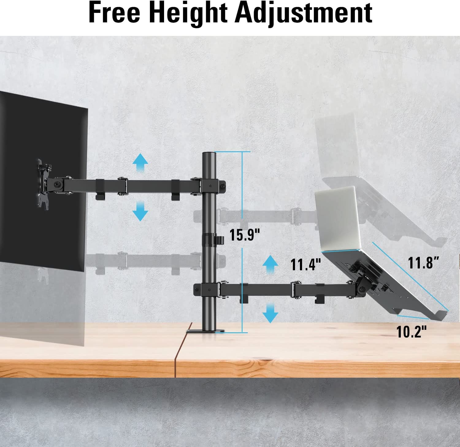 • FLEXIBLE VIEWING –Offers +90° to -90° tilt, ±90° swivel, 360° rotation, and height adjustment along the center pole. Monitor arm max extension: 16.3 inch. The mobility of both monitor arms and joints is completely sufficient for setting a perfect viewing angles and positions.