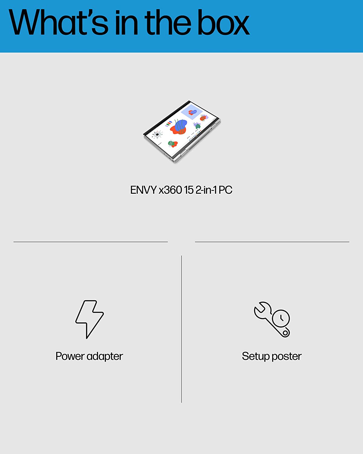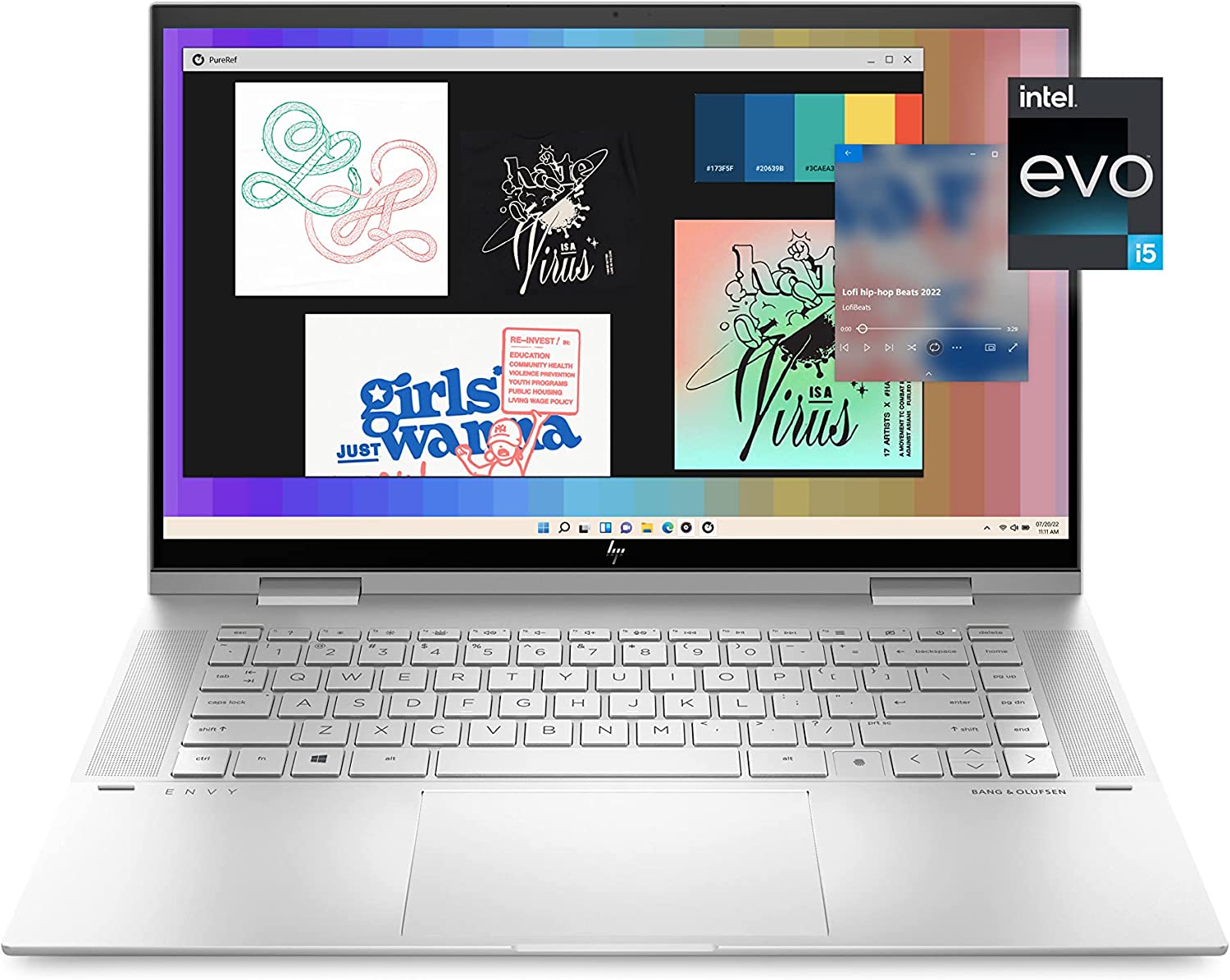 Modernize your world with the HP ENVY x360 Convertible Laptop with stellar imaging, the familiar Windows 11 Home OS (1), and best-in-class security features. Easily edit your work with a pinch or a swipe—right from the screen, thanks to this laptop’s crystal-clear 15.6-inch Full HD (1920 x 1080p), IPS, and edge-to-edge glass touchscreen (2). Complete projects in no time; this HP laptop computer features lightning-fast processing power brought to you by the Intel® Evo™ platform powered by 12th Generation Intel® Core™ i5-1240P (3). Enjoy life-like images from Intel® Iris® Xe Graphics (4) Work more efficiently and productively with 12 GB of RAM and 512 GB PCIe® Gen4 NVMe™ M.2 SSD (5), giving your HP computer ample storage for all your projects. Never worry about losing power; this HP laptop provides up to 9 hours and 45 minutes of battery life (6) with mixed usage. What’s more, HP Fast Charge takes your computer from 0 to 50% charge in approximately 30 minutes so you can get back to work fast (7). Create and innovate with peace of mind knowing your HP 15 laptop is also protected by a 1-year limited warranty. Work, study, and create—all while maintaining rock-solid connections thanks to this computer’s Wi-Fi 6E (2x2) (8) and Bluetooth® combo (9). Communication is more secure than ever with an HP Wide Vision HD camera with a physical camera shutter that protects your privacy when not in use, while dual array digital microphones can be easily muted with just the press of a button on the backlit keyboard (10). Additionally, the sleek and modernized backlit keyboard lets you work more comfortably—even in lowlight environments; plus, the built-in fingerprint reader (11) helps keep your content secure. Now, you can create, innovate, and play sustainably, your HP 15.6 laptop is designed with recycled materials (12,13,14) and is ENERGY STAR® certified (15) and EPEAT® Gold registered (16). (1) Not all features are available in all editions or versions of Windows. Systems may require upgraded and/or separately purchased hardware, drivers, software or BIOS update to take full advantage of Windows functionality. Windows is automatically updated and enabled. High speed internet and Microsoft account required. ISP fees may apply and additional requirements may apply over time for updates. See http:// www.windows.com. (2) All performance specifications represent the typical specifications provided by HP's component manufacturers; actual performance may vary either higher or lower. Full High Definition (FHD) content is required to view FHD images. (3) Multi-core is designed to improve performance of certain software products. Not all customers or software applications will necessarily benefit from use of this technology. Performance and clock frequency will vary depending on application workload and your hardware and software configurations. Intel’s numbering, branding and/or naming is not a measurement of higher performance. Intel, Pentium, Intel Core, Celeron, Iris Xe, Intel logo and the Intel Inside logo are trademarks of Intel Corporation in the U.S. and other countries. (4) Shared video memory (UMA) uses part of the total system memory for video performance. System memory dedicated to video performance is not available for other use by other programs. (5) Actual formatted capacity is less. Portion of internal storage is reserved for preloaded content. Based on HP internal testing using CrystalDiskMark benchmarking software. Performance is sequentially read compared to SATA SSD. (6) Windows MobileMark 18 battery life will vary depending on various factors including product model, configuration, loaded applications, features, use, wireless functionality, and power management settings. The maximum capacity of the battery will naturally decrease with time and usage. See bapco.com/products/mobilemark-2018/ for additional details. (7) Recharges your battery up to 50% within 30 minutes when the system is off (using “shut down” command). Recommended for use with the HP adapter provided with the notebook, not recommended with a smaller capacity battery charger. After charging has reached 50% capacity, charging speed will return to normal speed. Charging time may vary +/-10% due to System tolerance. (8) Wi-Fi 6E requires a Wi-Fi 6E router, sold separately, to function in the 6GHz band. Availability of public wireless access points limited. Wi-Fi 6E is backwards compatible with prior 802.11 specs. And available in countries where Wi-Fi 6E is supported (9) ) Bluetooth® is a trademark owned by its proprietor and used by HP Inc. under license. (10) Features may require software or other 3rd party applications to provide the described functionality. Internet service required and not included. (11) Wireless access point and internet service required and sold separately. Availability of public wireless access points limited (12)Percentage of post-consumer recycled plastic contained in keycaps varies by product.