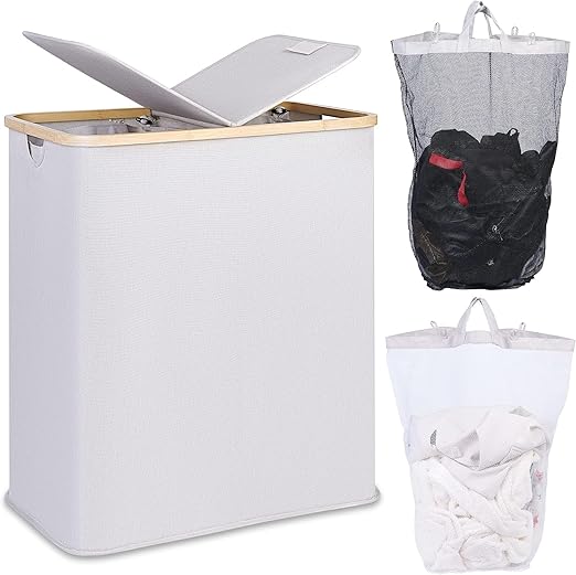 AM The America Store - Double Laundry Hamper with Lid, Divided Laundry Hamper with Removable Bags, 2 Section Dirty Clothes Basket with Handles for Bathroom, Bedroom & Laundry Room, 150L (WHITE)