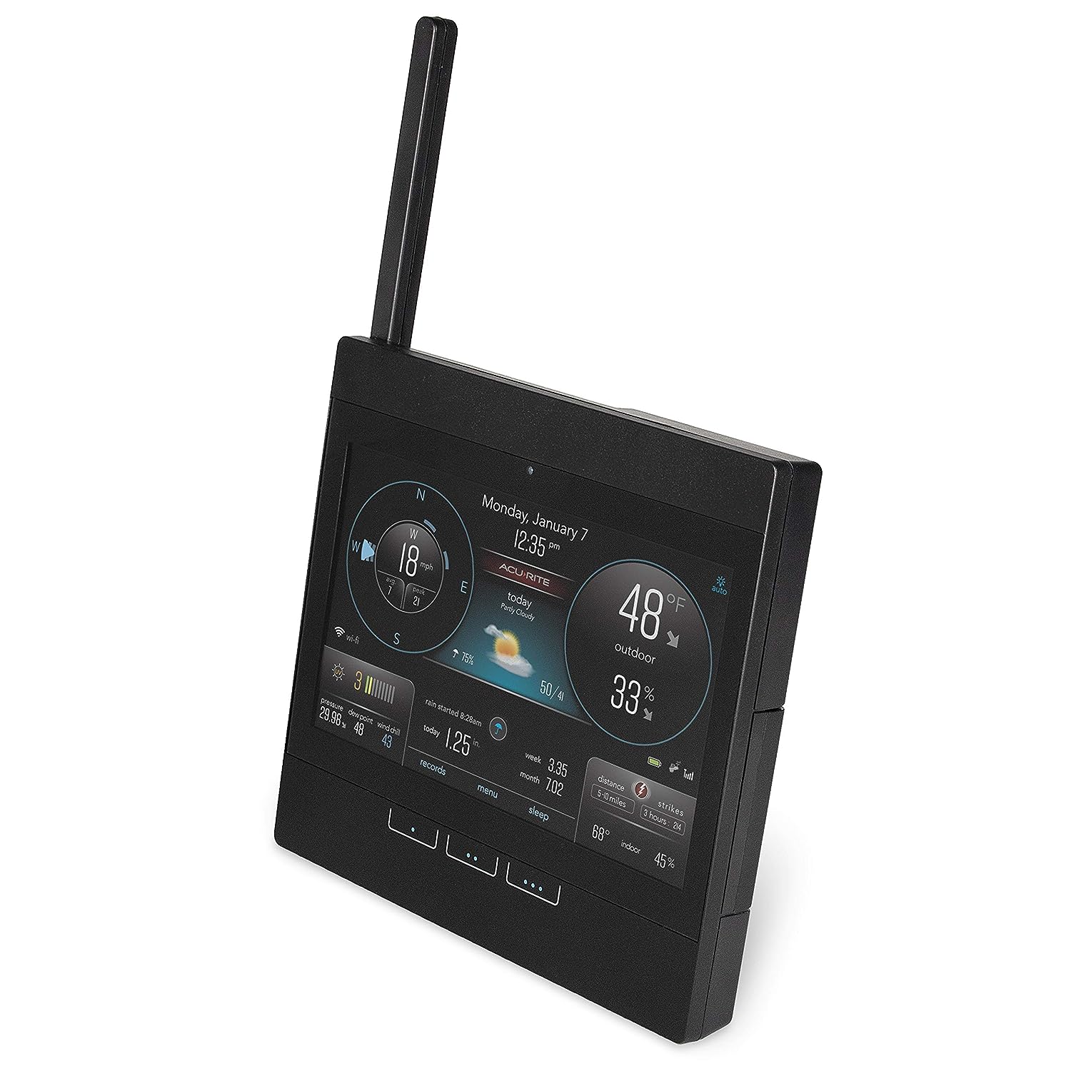 The AcuRite Atlas Professional Home Weather Station with Direct-to-Wi-Fi HD Display has lightning detection, an indoor/outdoor thermometer (wireless outdoors), an indoor/outdoor humidity monitor, a rain gauge, a wind gauge (with wind speed and direction), and a built-in barometer. The included wireless outdoor weather station and the indoor weather station provide you with hyperlocal weather at your fingertips. Perfect for home, office, or business use, this weather stattion allows you to monitor your backyard weather conditions from anywhere with the My AcuRite mobile app and Weather Underground. Protect your family, the house, and your garden with minute-by-minute updates in weather changes, including the outdoor temperature, humidity, wind speed/direction, rainfall, UV, and light intensity. Additionally, the display (with an inside outside thermometer) measures indoor temperature, humidity, and barometric pressure. Together, this weather thermometer and temperature gauge (indoor and outdoor data) can provide you with your own personal weather center. With this weather station with rain gauge and wind speed (anemometer outdoors), create custom programmable alarms that notify you when critical conditions change so you can identify emerging risks and know when to take action. Share real-time weather details with anyone using the Weather Underground online community. Boost your smart home with this WiFi-connected weather stations wireless indoor outdoor sensor that provides data to your phone, tablet, computer browser, and to the HD, auto-dimming color display. The included digital weather station display (which can be used as a portable weather station wherever there’s a wall outlet) connects to your 2.4 GHz WiFi network, so you can view your weather data from anywhere on the My AcuRite desktop website or app. This weatherstation (estacion meteorologica) comes with a one-year limited warranty.