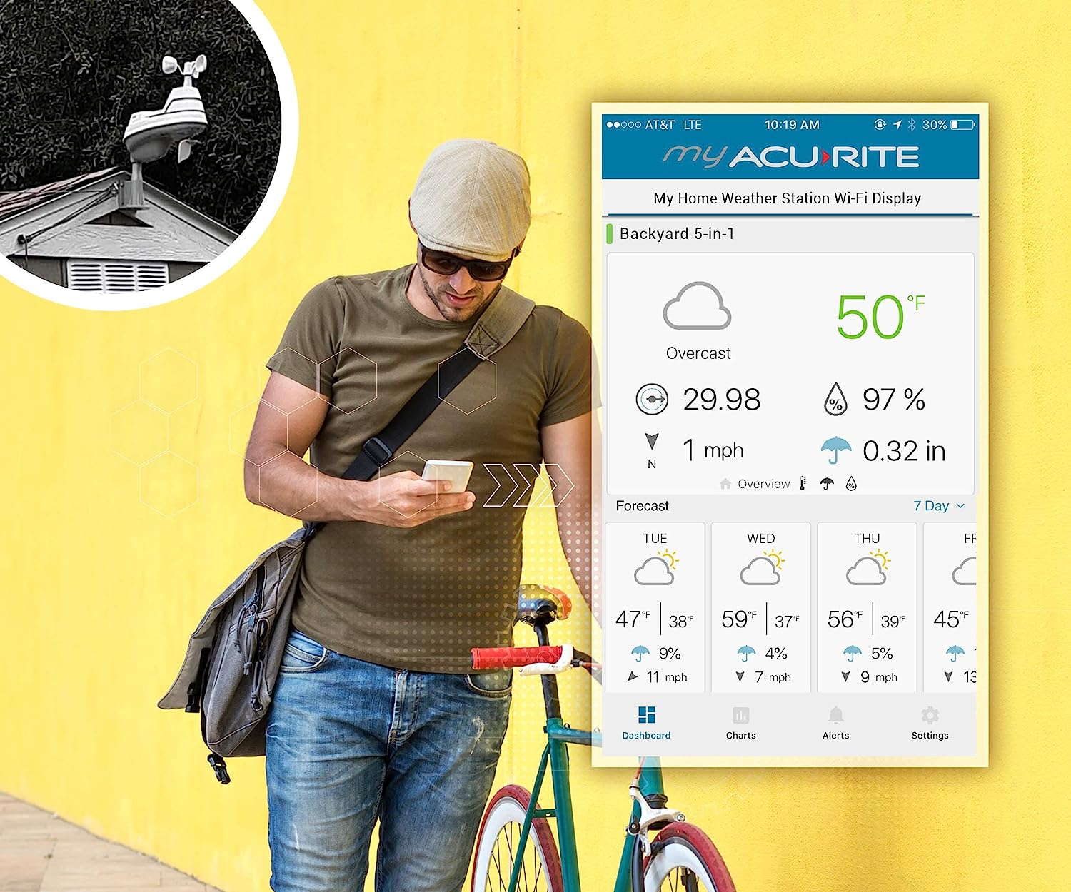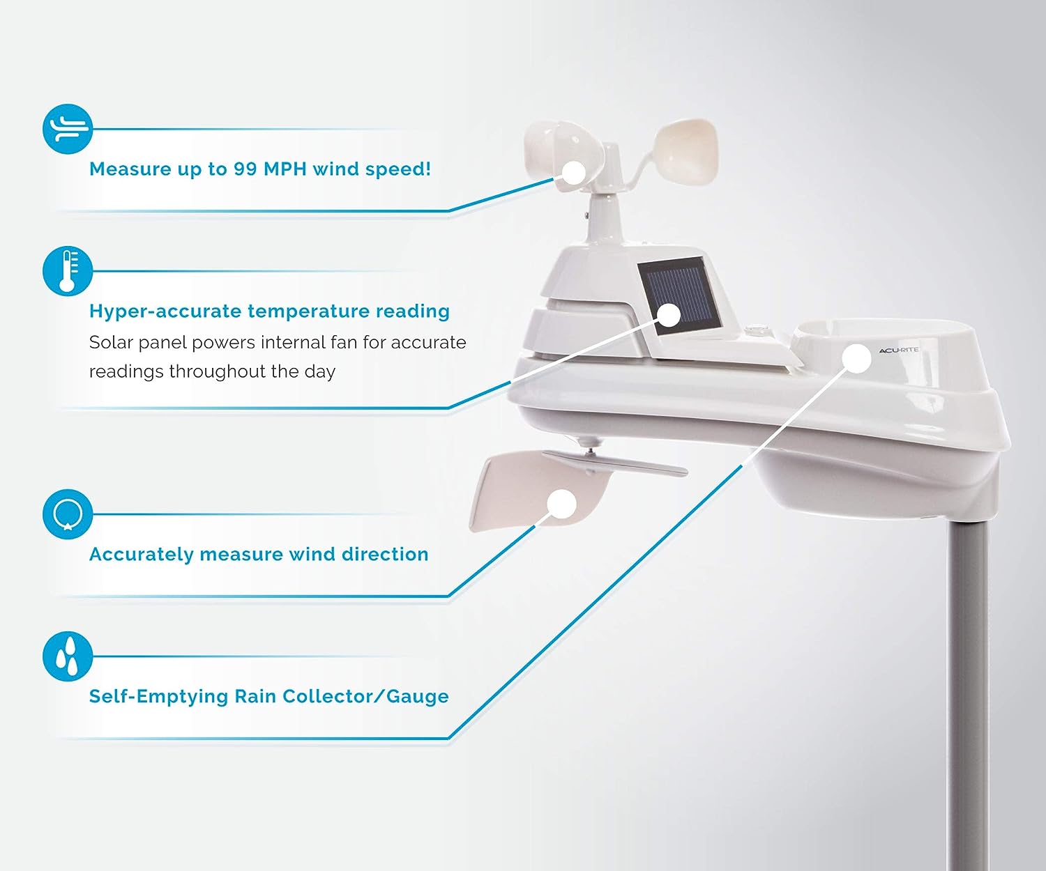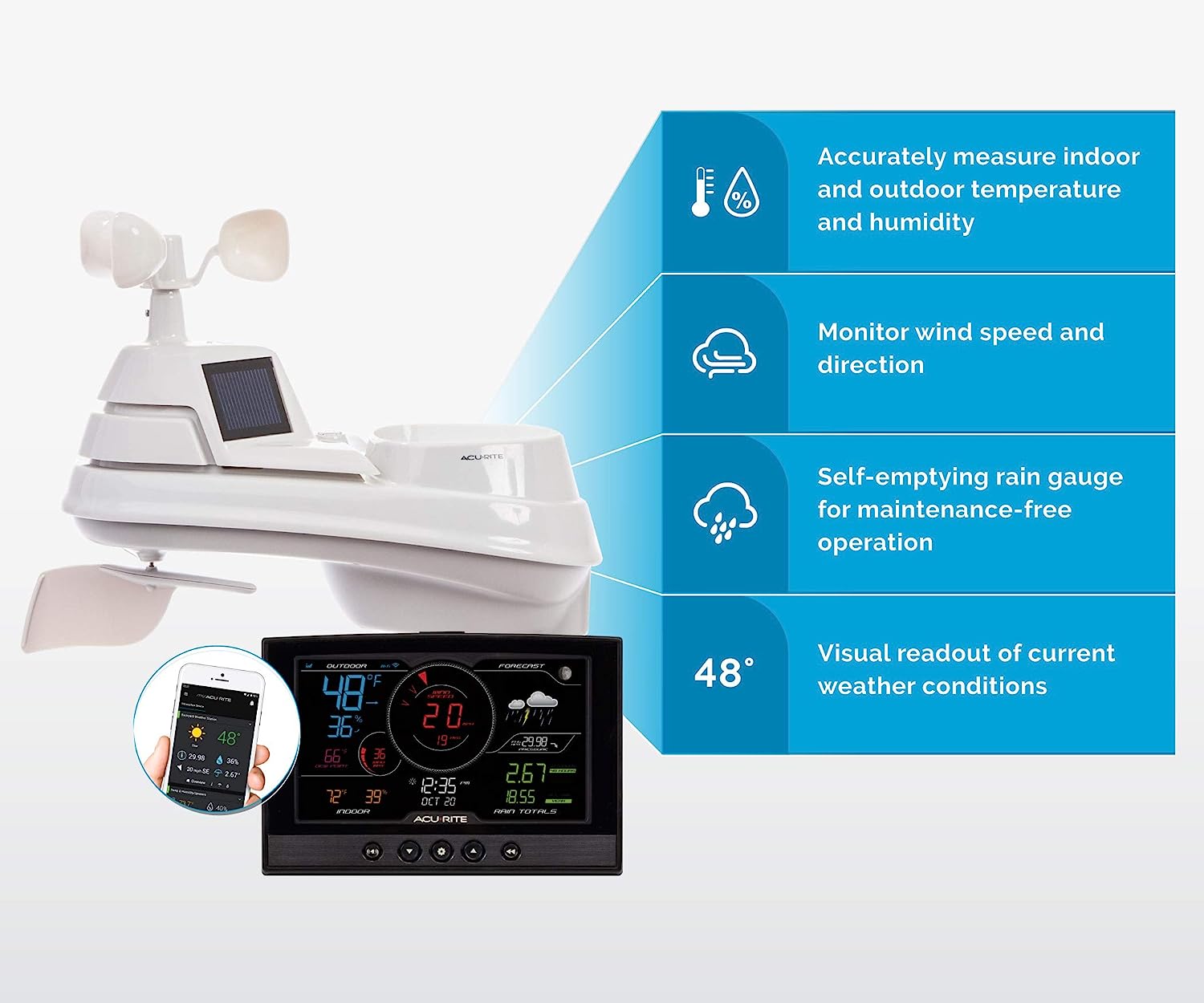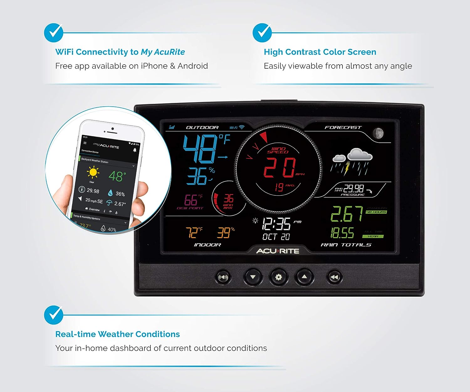 Enabled for home or business use, this AcuRite Wi-Fi Wireless Weather Station has a professional feel at a personal price. Not only will you know ambient weather conditions like air temperature, but you’ll also know barometric pressure thanks to an in-unit barometer and wind speed and direction thanks to an anemometer (say goodbye to old-school wind vanes and anemometers!). Additionally, a wireless rain gauge measures rainfall. The outdoor weather station remote sensor reaches up to 330 feet (100 meters) using a 433 MHz wireless signal. The best-in-class weather display allows easy and straightforward readability of information, like that seen on an indoor/outdoor thermometer, from almost any angle. The cleverly designed information center allows for maximum info without clutter and provides time and date, acting as a weather clock and electronic calendar. This smart weather station is compatible with Amazon Alexa and Google Home devices, a feature that only the best weather station could boast. With this professional home weather station, you will get alerts from almost anywhere, whether you're in the RV or up at your summer home. Share all your weather data with this weather underground weather station with your closest friends and family. Reliable and accurate weather data with hyperlocal measurement.