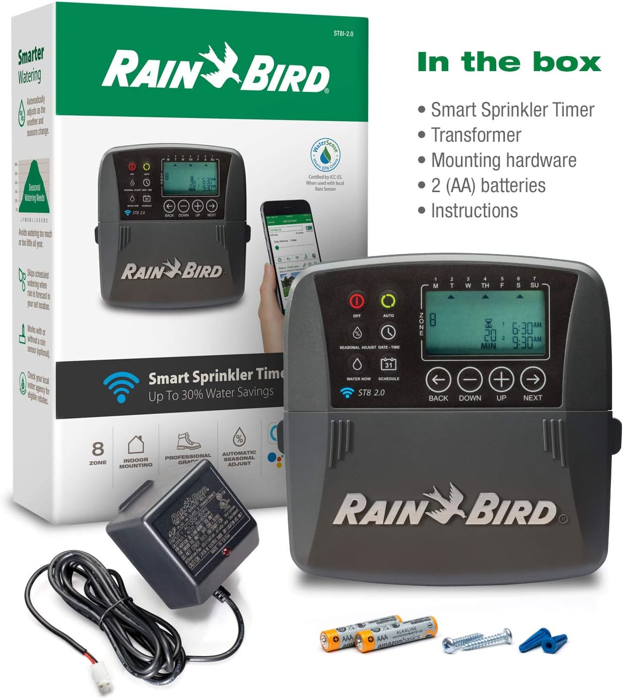 Rain Bird ST8I-2.0 Smart Indoor WiFi Sprinkler/Irrigation System Timer/Controller, WaterSense Certified, 8-Zone/Station, Compatible with Amazon Alexa