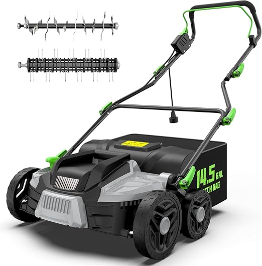 16-Inch 15.5 Amp 2-in-1 Electric Dethatcher and Scarifier with 14.5-Gallon Removable Thatch Collection Bag, Lawn Dethatcher with 5-Position Depth Adjustment, Quick-Fold, Keeps Lawn Healthy