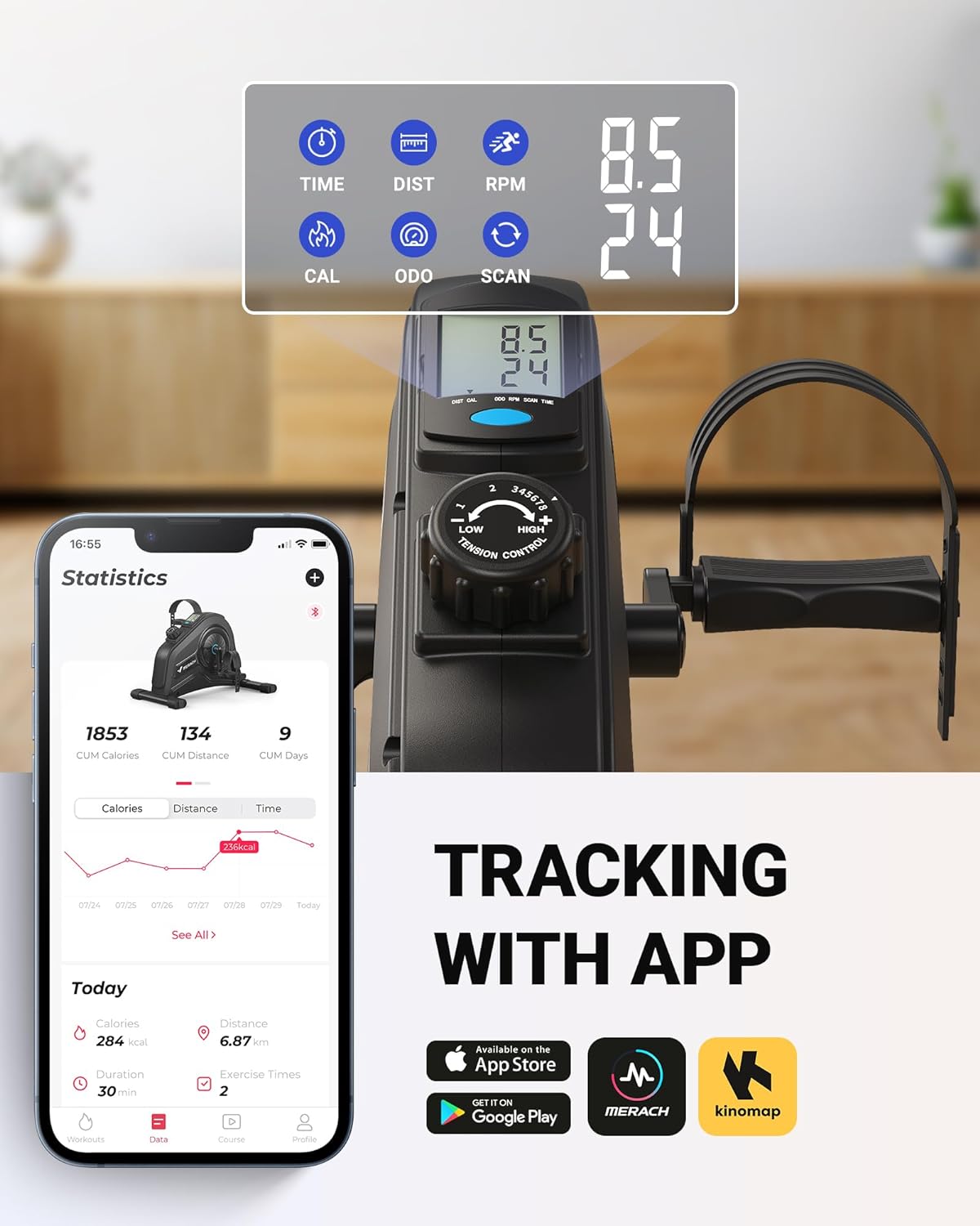 • Tailored Progress Tracking: Enjoy the freedom to track your progress your way. Whether you opt for the built-in LCD screen for data recording or connect seamlessly to the MERACH or Kinomap app to personalize your exercise plans, our foot desk cycle offers the flexibility you deserve.