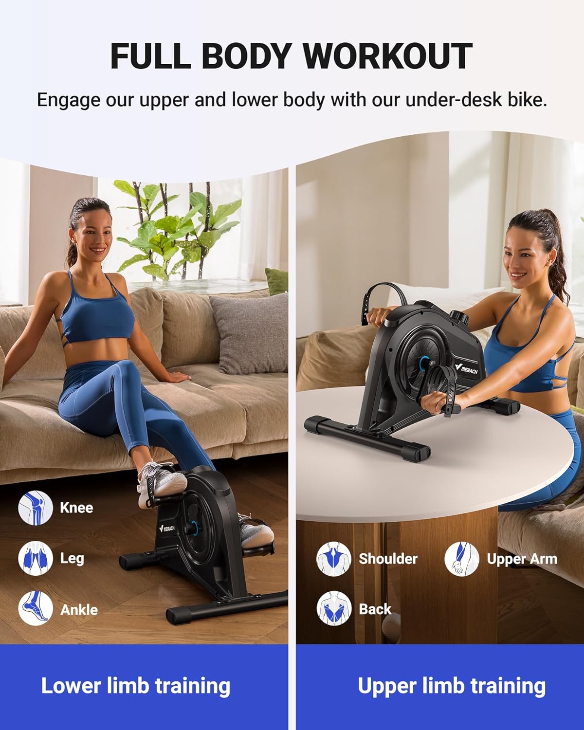 Under Desk Bike Pedal Exerciser, Quiet Magnetic Mini Exercise Bike with MERACH App for Arm, Leg Recovery, Physical Therapy, Smooth Foot Desk Cycle with 2 Resistance Bands & Non-Slip Mat