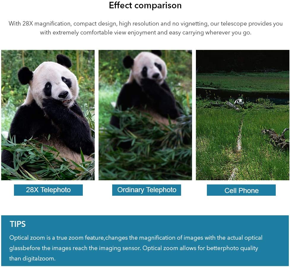 • HD Telescope : 28 times long shooting can record clear targets, a long focus telescope with an eye Mask can be used for long distance shooting (it can be used without a phone as a single eye. With shutter for easy access.