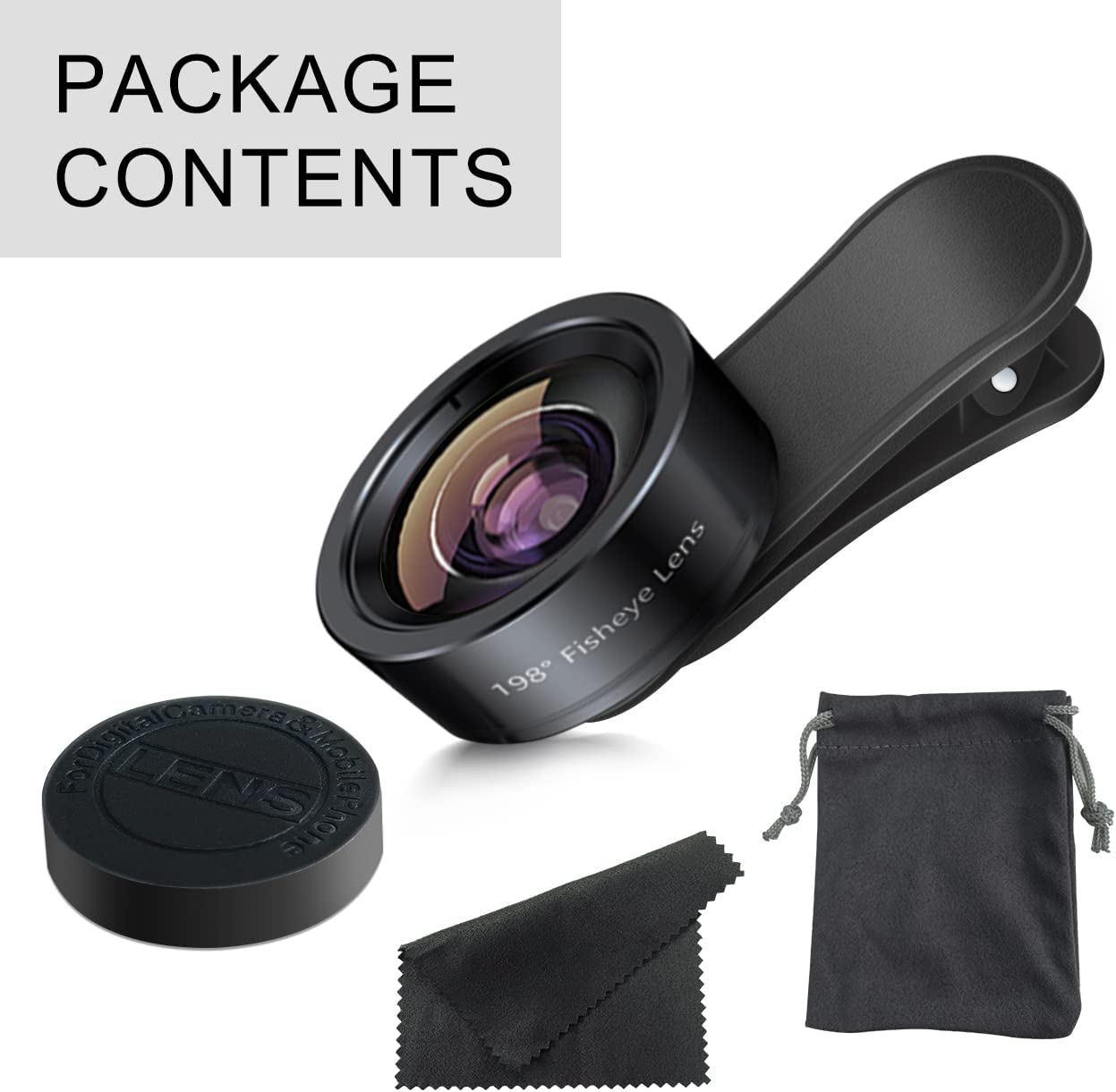 • 【Package Content】1x198° Fisheye Lens, 1x Universal Clip, 1x Storage Bag, 1x Cleaning Cloth, 1x User’s Manual