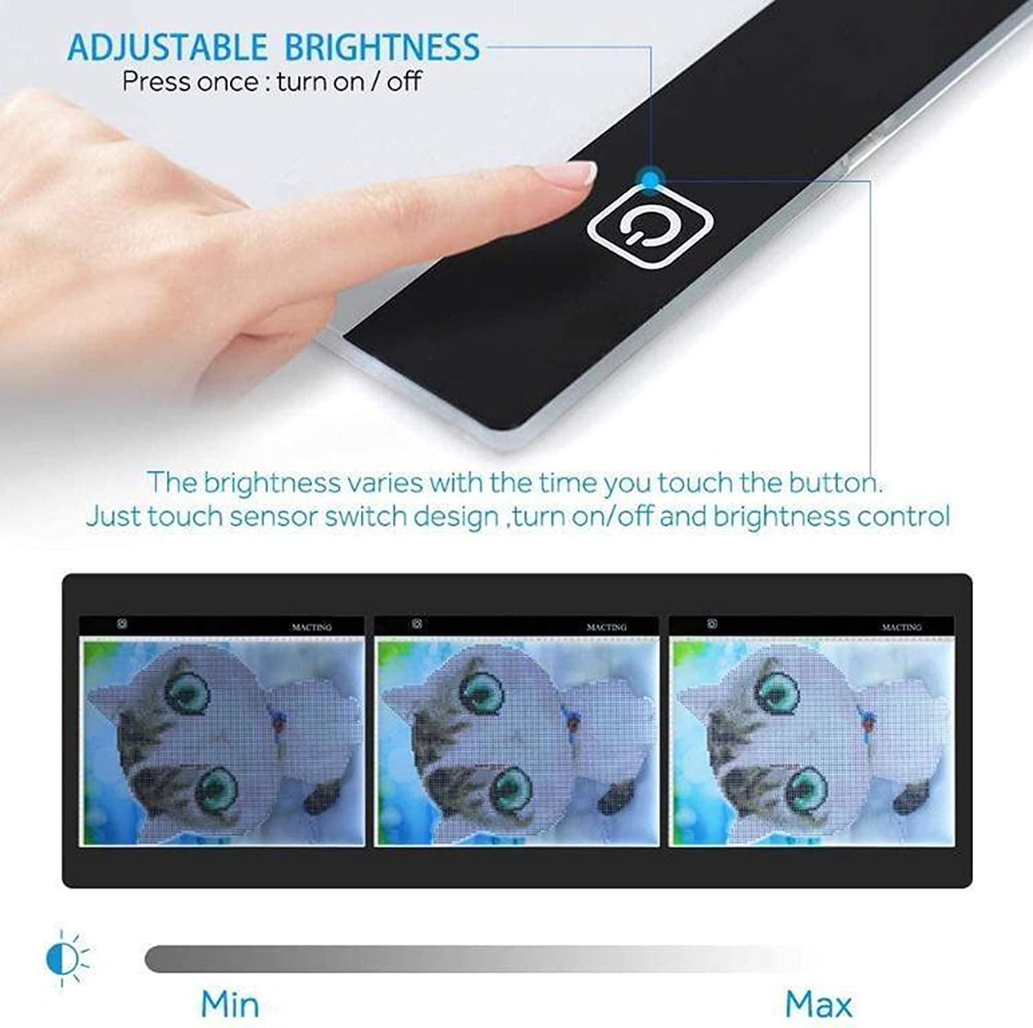 This art light tracing box has slim design, light weight, and powered by USB power source. The touch sensor button controls on, off and brightness. The light tracing box can be used for animation, art tracing, sewing, quilting, photograph and slides Viewing, etc.
