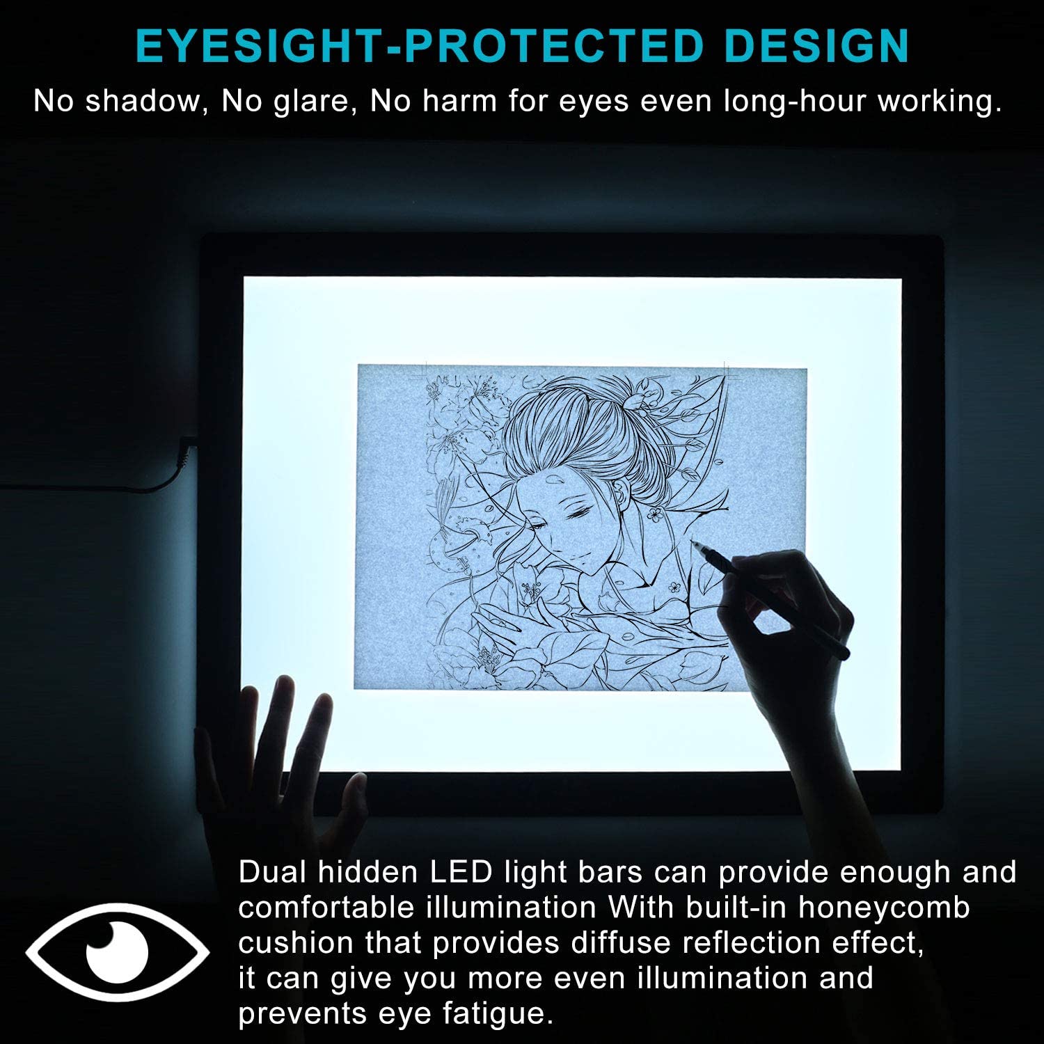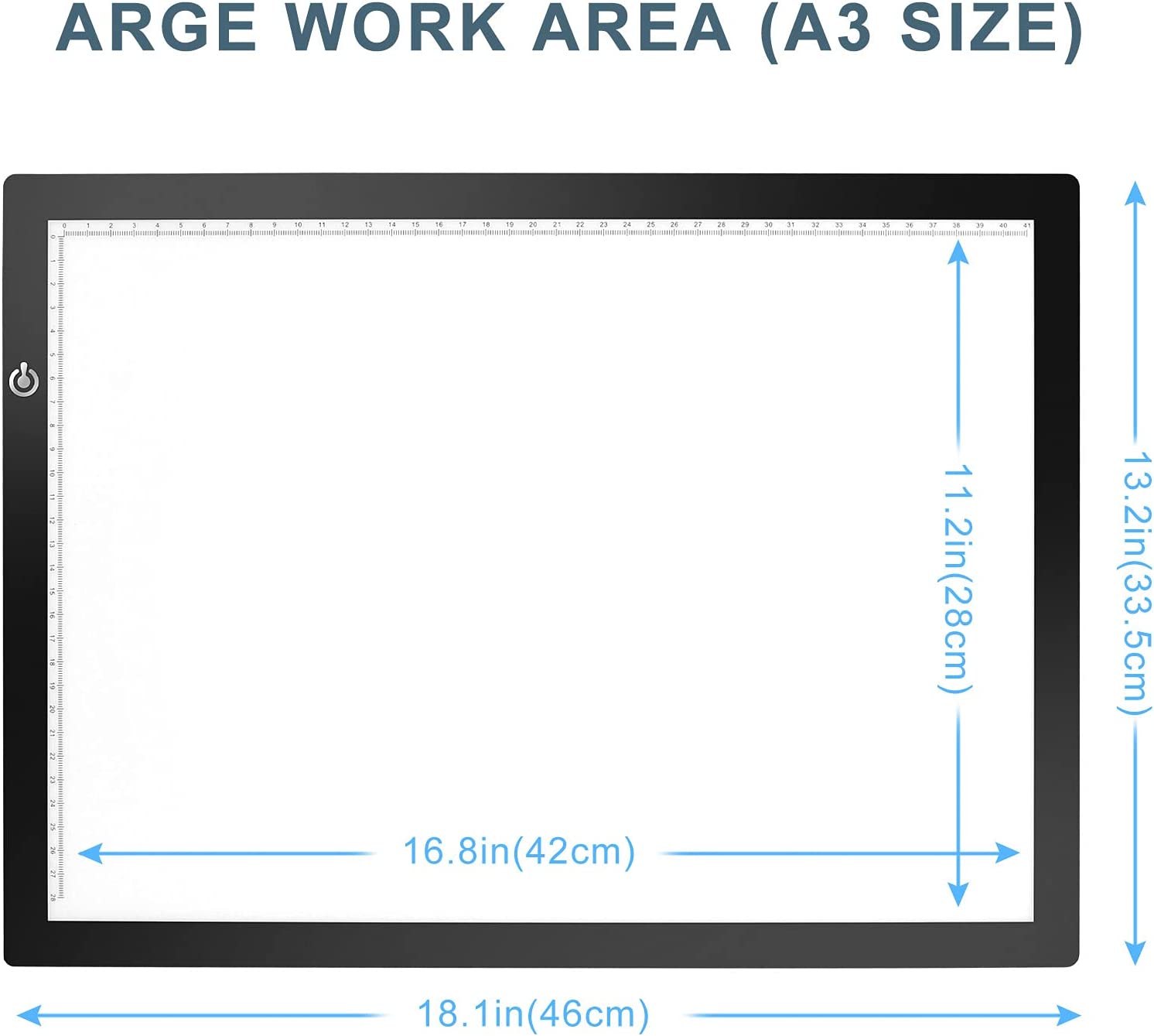 • The whole light pad dimension including black frame is L14.2” x W10.6” x H0.2”. The visual work area is 9" x 12”.