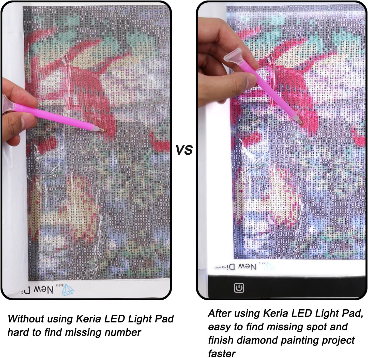 Keria LED Light Pad Light Box Light Tablet for 5D Diamond Painting Artcraft Tattoo Watercolour Copy Quilting Tracing. Please kindly note there is grid lines on light pad surface. This design help to protecting your eyes from being hurting by strong light. But it does not matter to using on diamond painting project.,