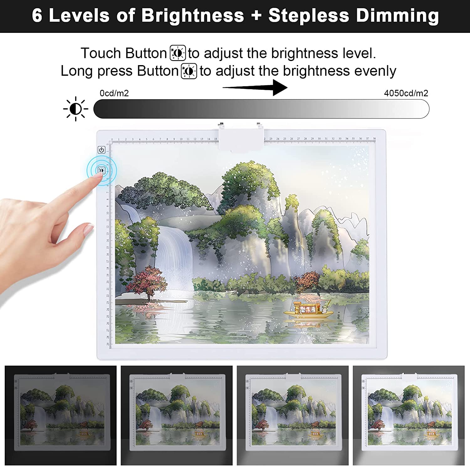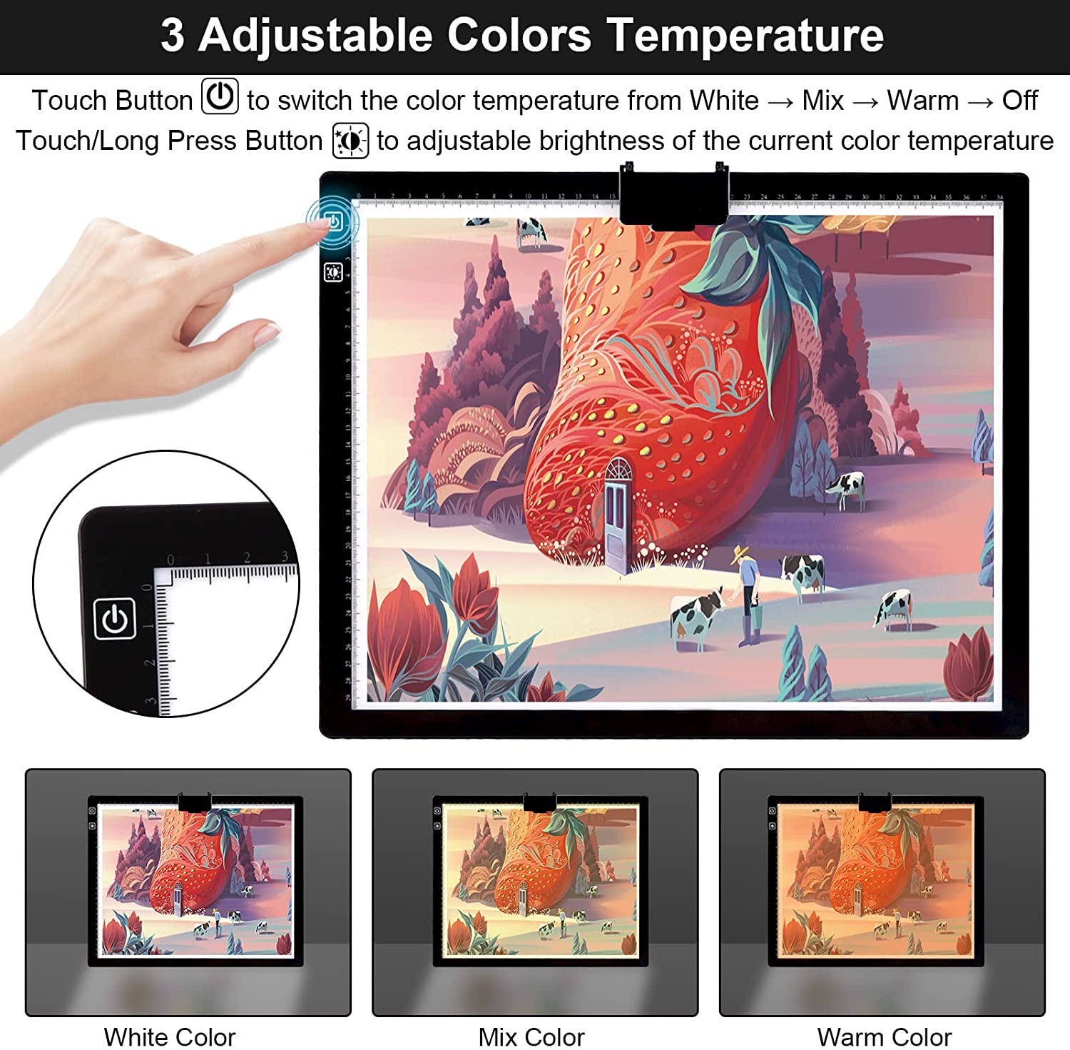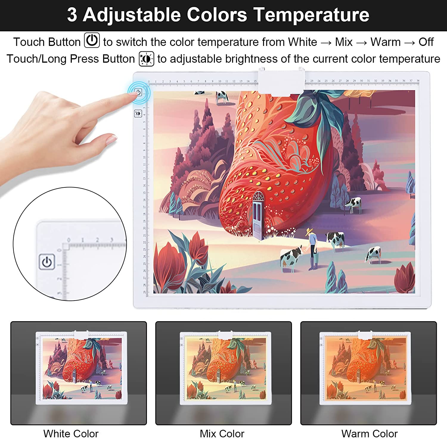 • 💘🎁【3 Light Colors Mode and Stepless Dimmable 6 Levels of Brightness】By smoothly touch the control to change the lighting mode to white, warm yellow or warm white. Each lighting mode has 6 adjustable brightness to choose from,easy control by long pressing the button to make the brightness to suit your artwork in different lighting conditions.This light pad makes every diamond painting canvas and paper look clearer.