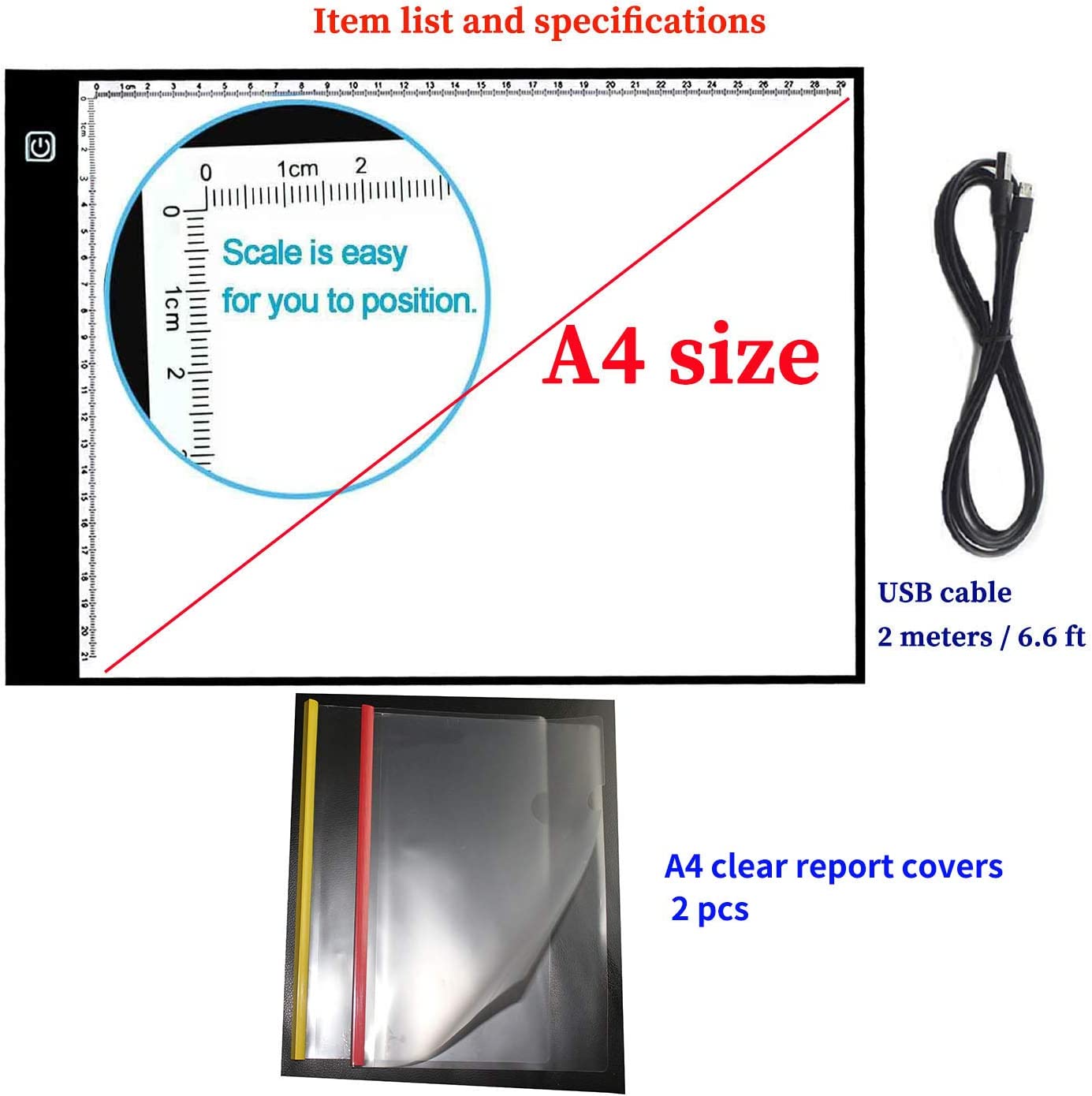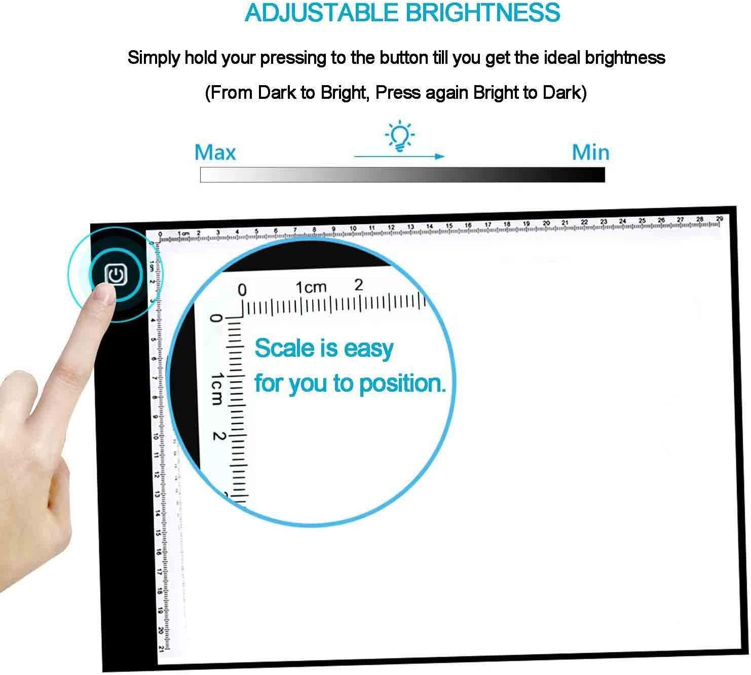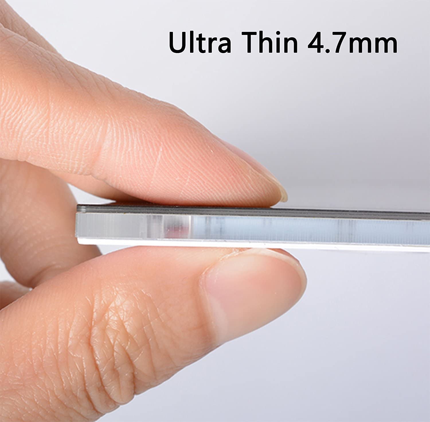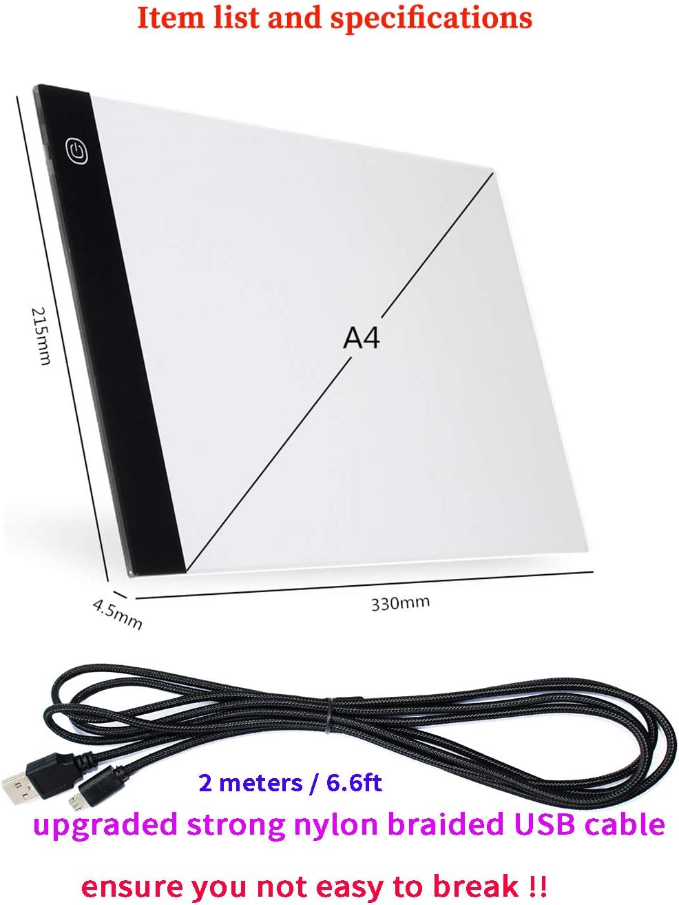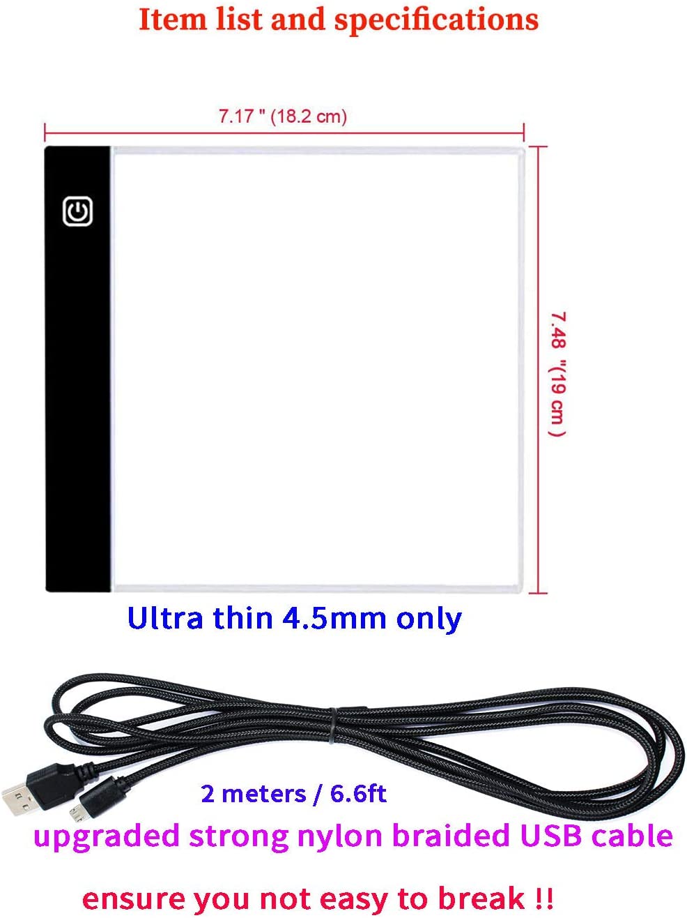 • ►◄ package includes: an A5 size Ultra Thin Led Light Pad + a 2m (6.6ft) nylon braided USB cable. ►◄ The thickness is only 4.5mm(less than 0.2 inches) which makes it easy to carry. The illumination is perfectly even, super bright, and flicker-free