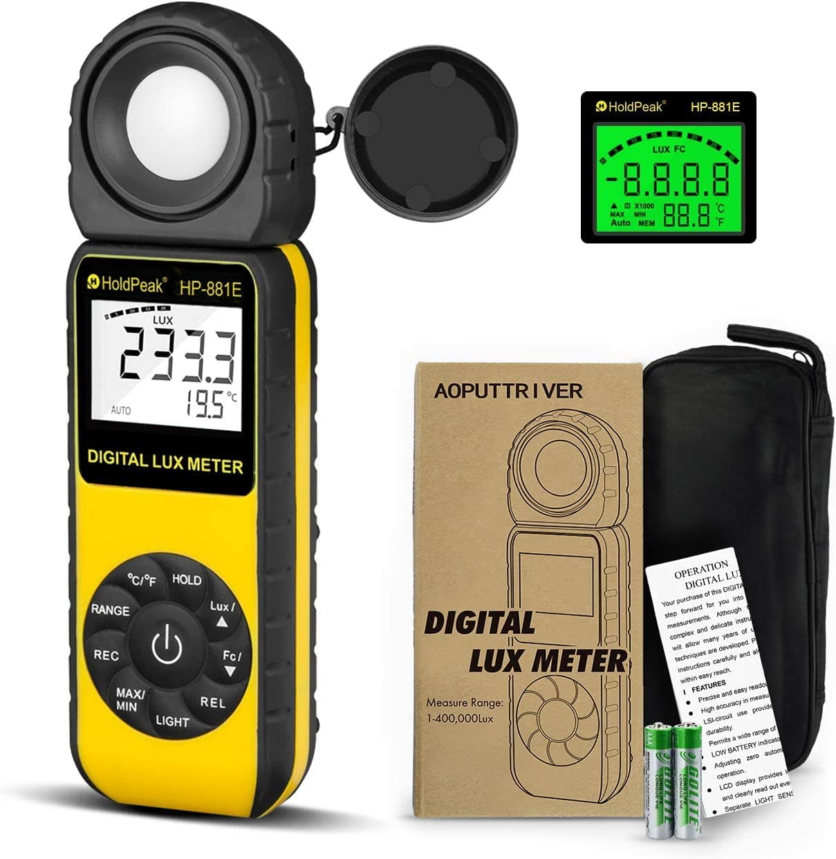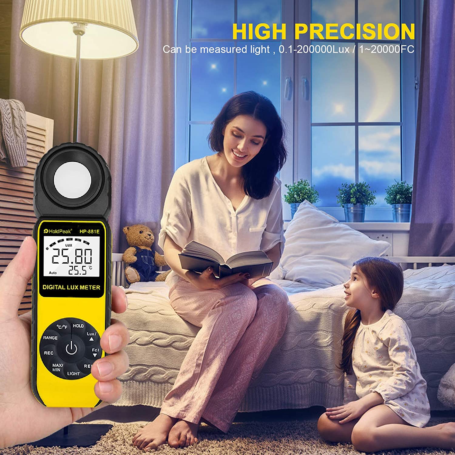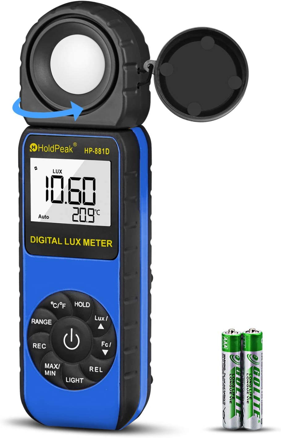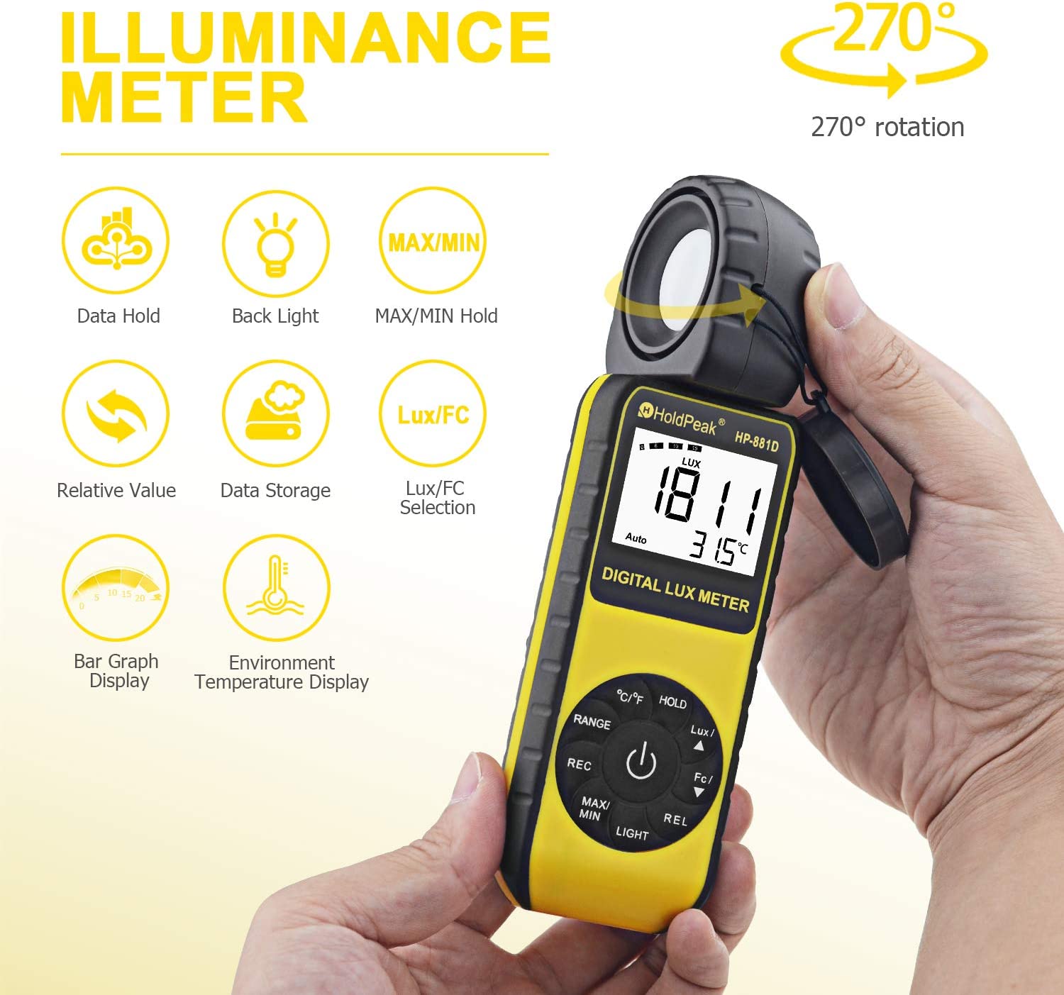 Light Meter-HOLDPEAK 881E Digital Illuminanc/Light Meter with 0.01~300,000 Lux (0.01~30,000 FC) Measuring Ranges and 270° Rotatable Detector for LED Lights and Plants Lumen Meter